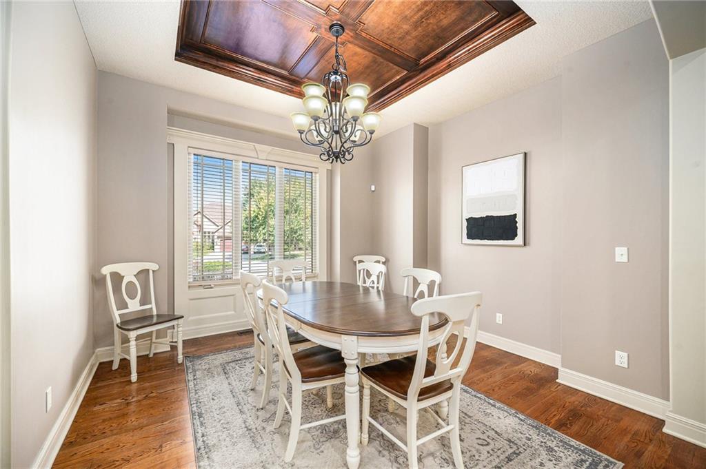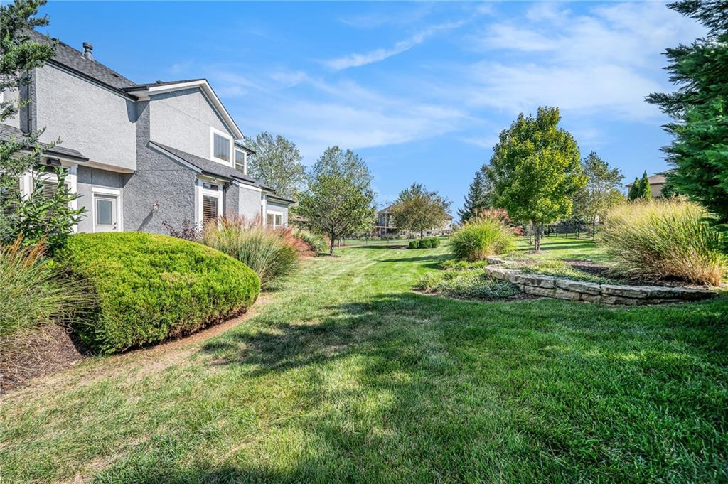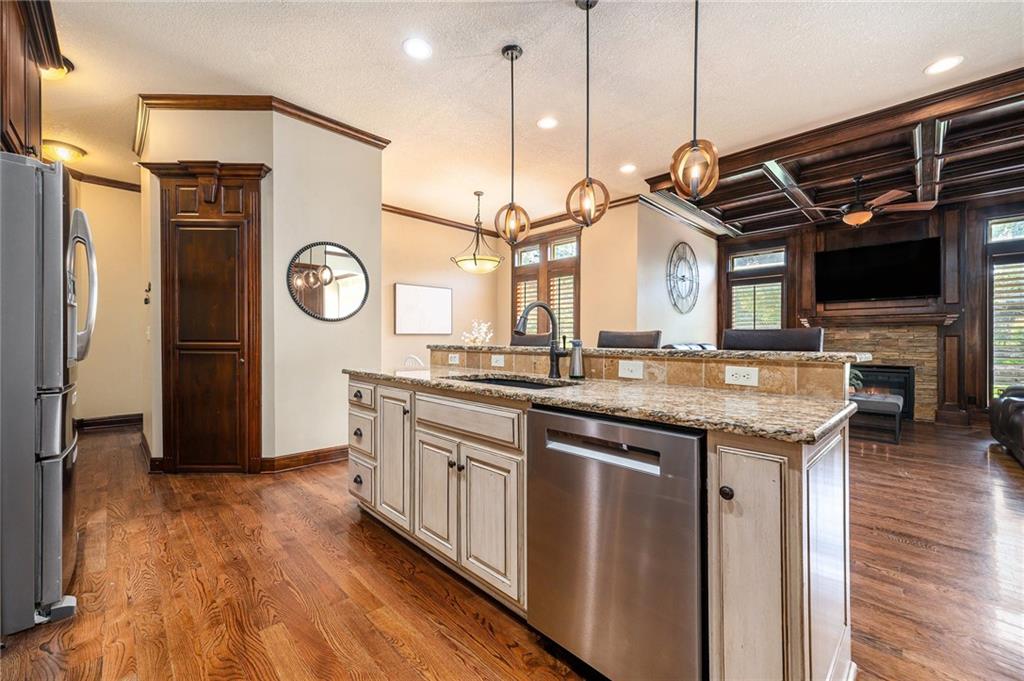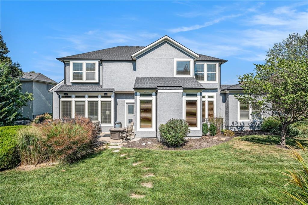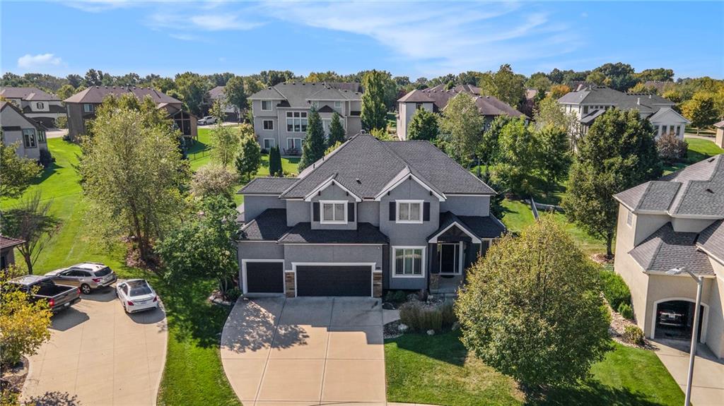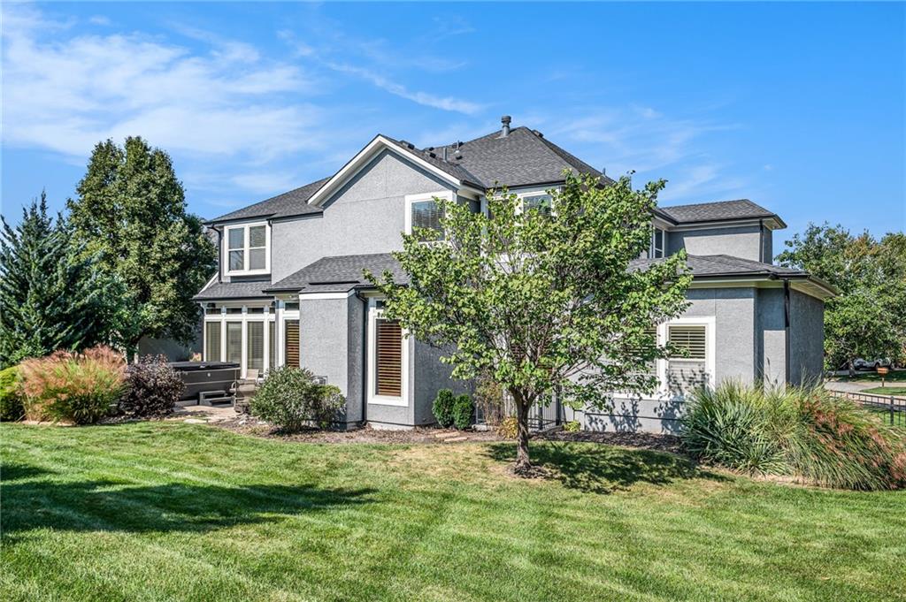 Eyes instantly draw up to the rich tone of the beamed ceilings in the formal dining room and hearth. A fireplace anchors both the living room and hearth adding a cozy touch to both entertaining spaces. Delightful details like a stacked stone accent wall, plantation shutters, double staircase, laundry at bedroom level and basement, a main floor office & two primary bedroom options make this residence both stylish and functional. The open concept great room that encompasses both the kitchen and hearth is anchored by a large kitchen island with seating–perfect for a quick morning breakfast. Newer stainless steel appliances include the oven, stove and dishwasher. Upstairs bedrooms all have walk-in closets including the oversized primary closet that would allow for a center island, maximizing organization, and also connects to the laundry room. The finished basement has a bedroom, full bath and is perfect for hosting watch parties–you won’t miss a minute of the action with food and drink stocked at the wet bar! Landscaping runs along the curve of the back patio elevating it into a picturesque and private setting for entertaining or unwinding in the hot tub. Well-maintained with a new roof, exterior paint, and hot water heater replacement within the last five years. The Coffee Creek Crossing community enjoys the prestigious Blue Valley School District as well as dining, shops and recreation at the new Blu Hawk development. Neighborhood amenities include a zero entry swimming pool, play ground, volleyball court and walking trails.