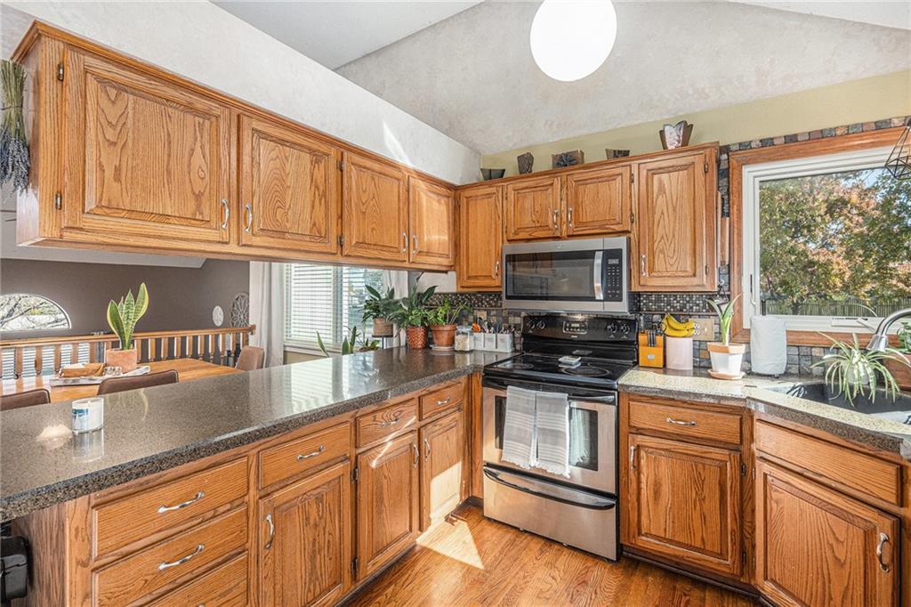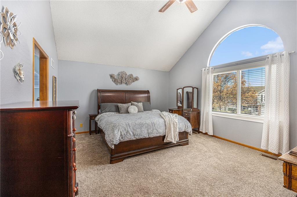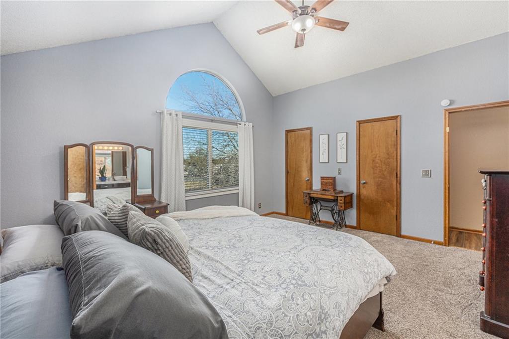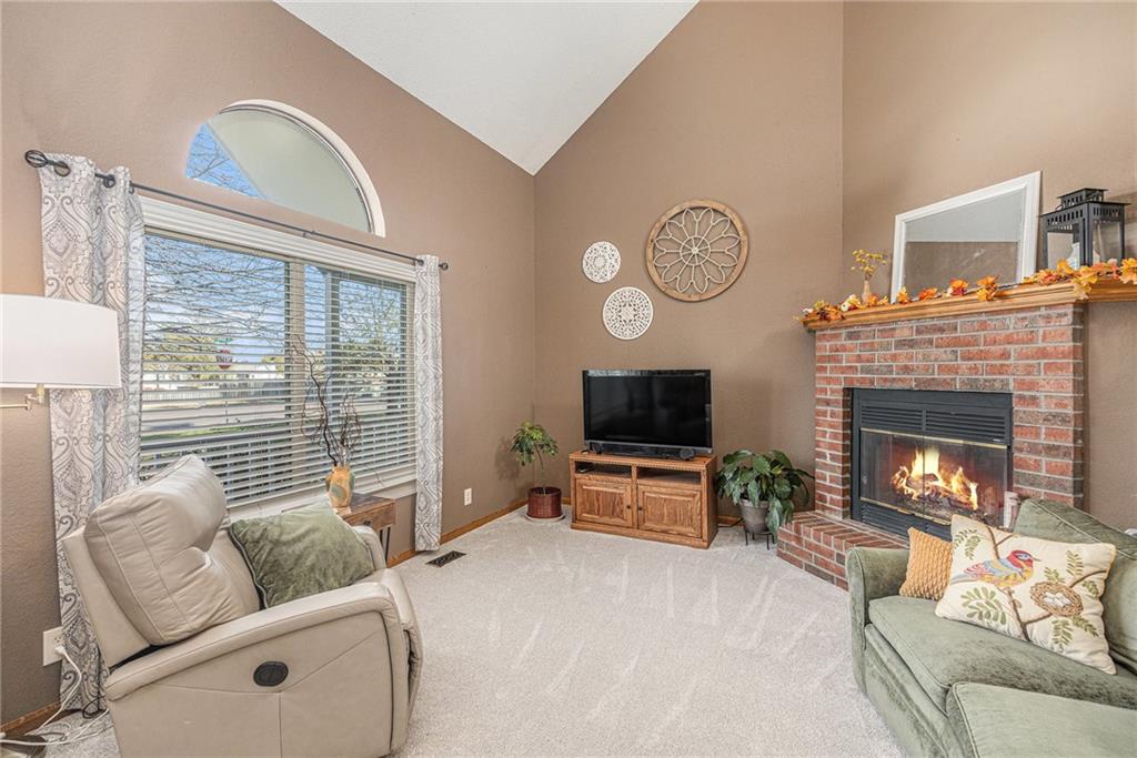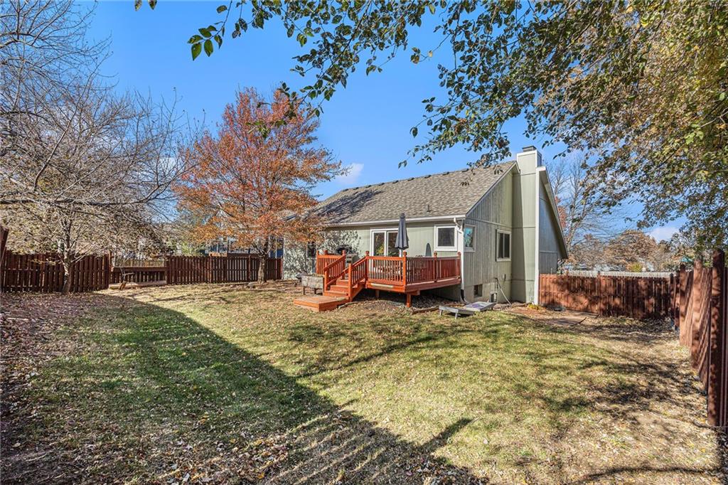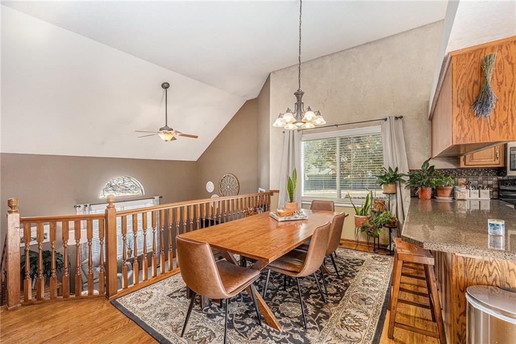 This beautiful home in the Blue Valley School District is close to award winning schools, parks, shopping, and more! Outside you are greeted by mature trees and landscaping and a welcoming front porch. Walk in to a spacious living room with soaring ceilings, a ceiling fan, a cozy fireplace with gas logs, an adorable accent wall, and brand-new carpet. The second level has hardwood floors throughout. A spacious dining room has room for your large table, is convenient to the kitchen, and overlooks the living room. The eat-in kitchen boasts granite counters, a tile backsplash, and handy bar seating. Also on the second level are two large bedrooms with carpet and walk-in closets, a laundry area, and a tiled bathroom with a shower/tub combo. Up a short set of stairs is an amazing primary suite with huge, gorgeous windows, double closets, soaring ceilings, and a ceiling fan. The updated primary bathroom features beautiful tile work, a separate tub and shower, and a double vanity. The basement level has a non-conforming 4th bedroom with a built-in desk, a walk-in closet, and a third full bathroom with tile and shower. The downstairs family room is huge! It is light and bright and boasts brand-new paint and carpet! The two-car garage has a handy work bench area and newer floor utility tiles. Walk out of the kitchen to a deck and a large, fully fenced backyard! The home features so many newer big-ticket items - a brand-new composite roof, durable cement board siding on the front and newer siding on the sides, newer Anderson windows, a newer hot water heater, and more! Don't miss out on this incredible opportunity!