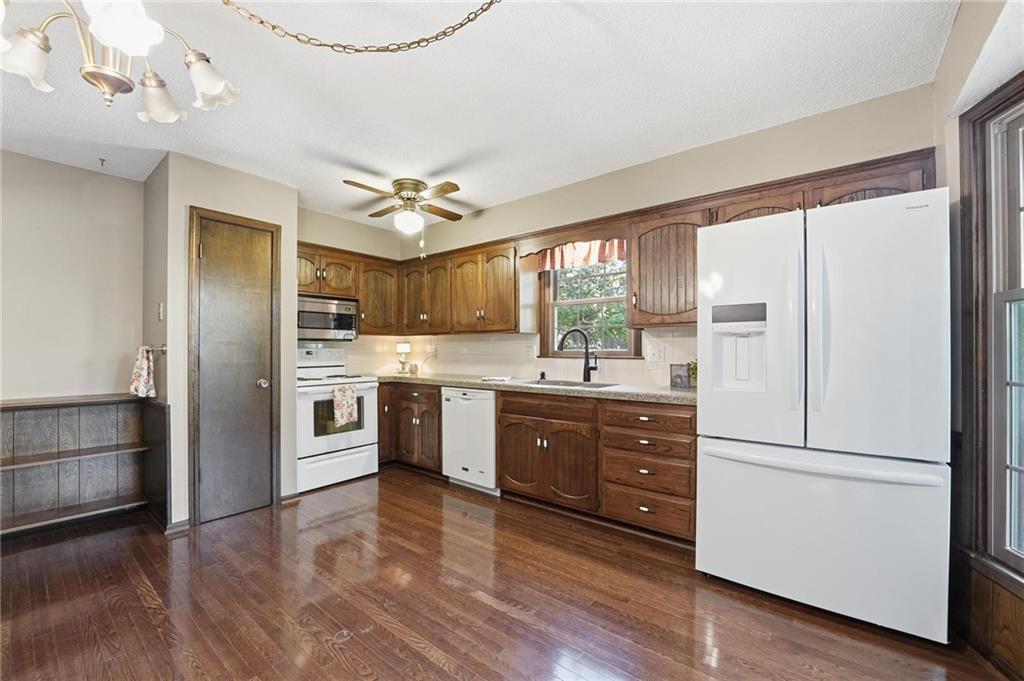 Welcome to this spacious, well maintained, one owner, 5 bed, 3.5 bath raised ranch home! This home features plenty of space for everyone! The updated kitchen has newer appliances (refrigerator stays!), granite overlay countertops, a pantry, and wood floors. The large family room contains a huge fireplace and hearth, bookshelves, and a vaulted ceiling. A deck off the family room is great for outdoor barbeques! The dining room is perfect for gatherings! The primary bedroom has a walk in closet. The primary bath has been updated with tile floors, tiled shower, and granite overlay countertops. Two more bedrooms grace the main floor. Two more ample bedrooms are located upstairs with a full bath. The walk out basement is perfect for entertaining. A wood burning stove, wet bar w/refrigerator, half bath, laundry room, and storage will make everyone happy! Don't miss the garage. It is enormous with a work bench and storage galore! Newer HVAC, hot water heater, and newer windows throughout make this a wonderful home! Don't miss this value!!