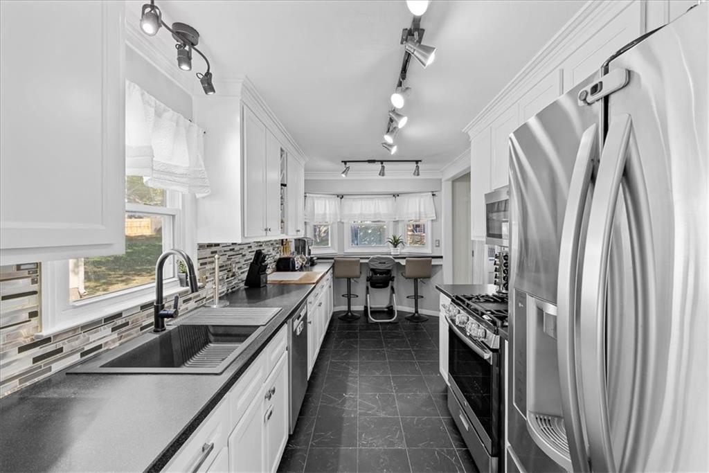 Perched on the corner of a quiet street, this raised ranch greets with fresh landscaping, new roof and low maintenance vinyl windows. Once inside, find a bright and airy formal living/dining area that are perfect for hosting those holiday gatherings. Speaking of gathering, the updated kitchen makes entertaining a breeze with open sight lines into the family room, updated cabinets, solid surface countertops and a gas stove for the home chef. The kitchen also offers a breakfast bar overlooking the large deck and fenced yard. The family room has a cozy hearth and hardwood floors add to the warmth. There are two sizable secondary bedrooms and an updated guest bath on the way back to the primary wing. Once inside the primary bedroom there is a small reading nook and access to a large main-level laundry room (a rare find in this area). A walk-in closet and updated en-suite add to the luxurious feel of the bedroom, and the wall of windows and vaulted ceilings truly make this an oasis. On the lower level there is partial finish with drywall and plenty of space for a rec room with cabinets in place and a half bath for guests. There is also a large storage room and access to the two car garage on this level. Nestled into quiet Red Bridge Meadows, this home offers a suburban feel with the ability to walk to neighborhood parks, grocery store and KC favorites like Barrio. Come experience life in one of south KC's most sought after areas!