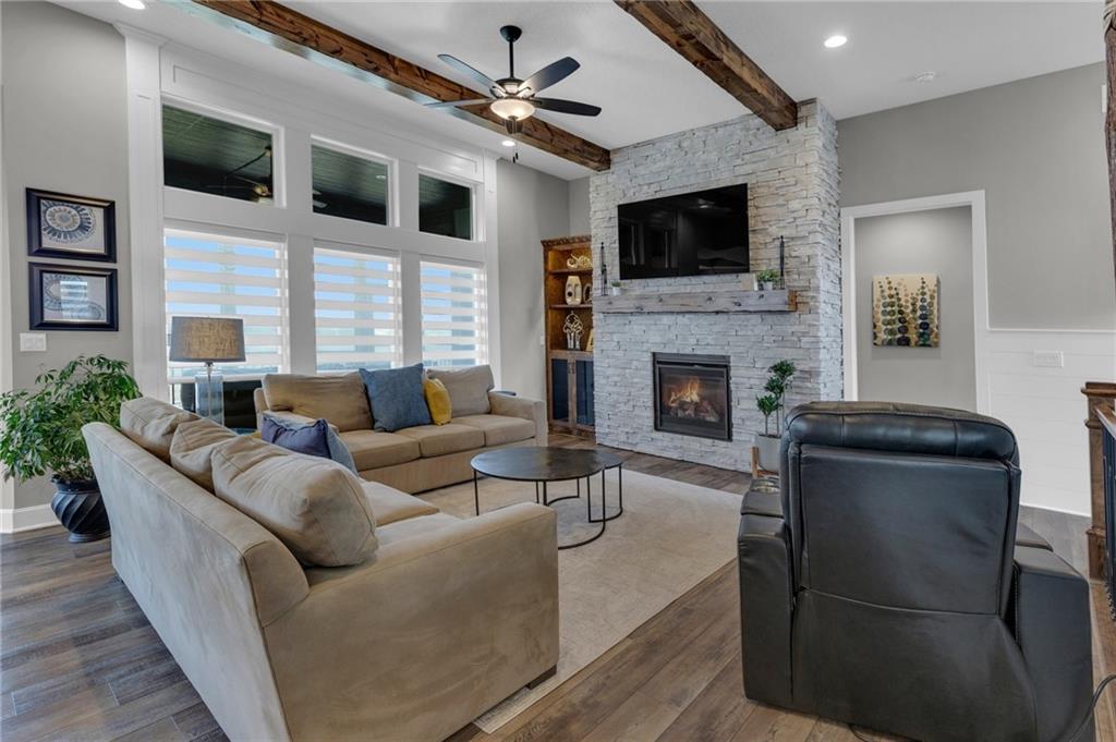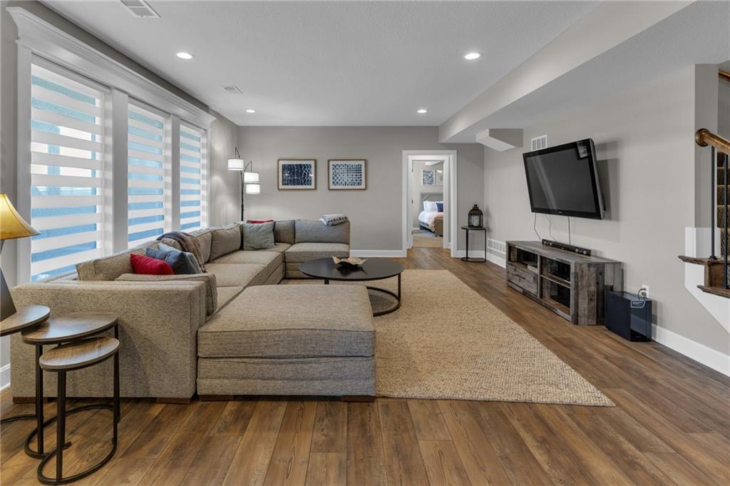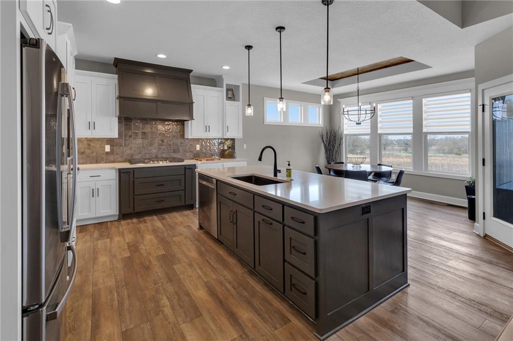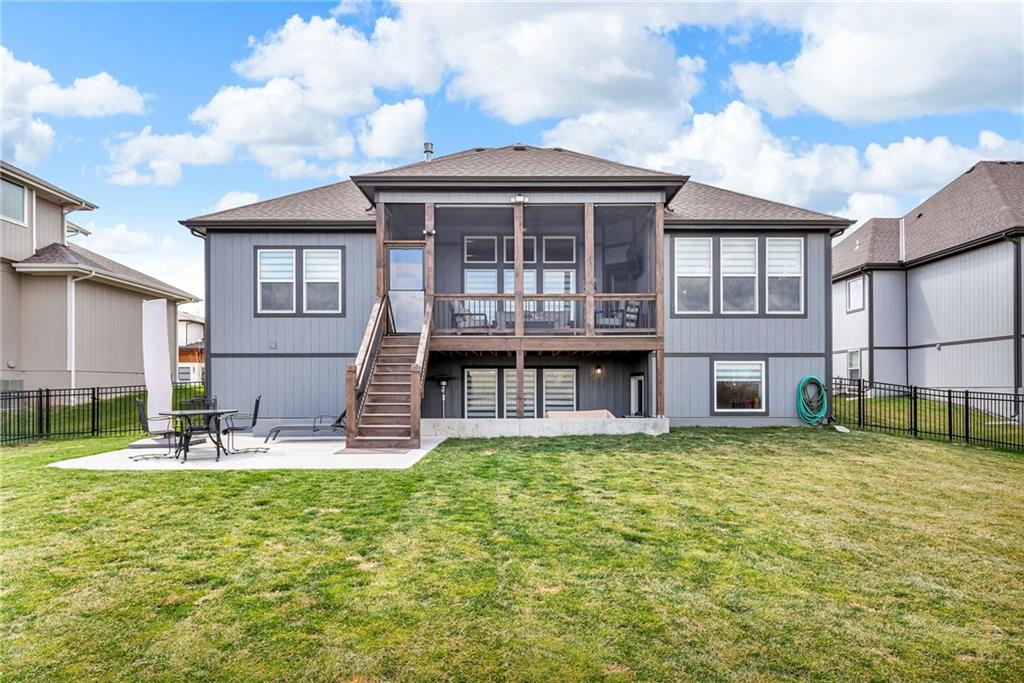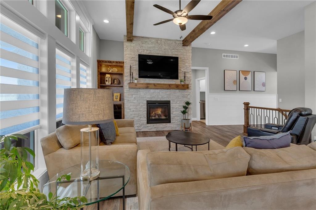 Welcome to 17701 Crystal St in the highly desirable Wolf Run Development! This fully upgraded home offers the option of attending Spring Hill OR Blue Valley School District (open enrollment available per KS House Bill 2567), with schools just 0.7 to 1.7 miles away. This home features 4 or 5 bedrooms (one used as an office) and 3.5 baths, with LVP flooring throughout, plus upgraded carpet in two lower-level bedrooms. The kitchen shines with quartz countertops, a touch-screen oven with built-in air fryer, professional gas cooktop with vented hood, and a vaulted dining area ceiling. Modern window treatments balance privacy and natural light. Step into a fully screened outdoor living space, equipped with professionally installed Sun Shades. The lower-level bath has a glass-enclosed shower, and a tankless water heater ensures endless hot water. The zero-entry master shower boasts two heads and a bench seat for stress relief. The master bedroom features a wood-vault ceiling and private porch access, while the closet offers pull-down rods to maximize storage. The entryway features stunning shiplap and a handcrafted vaulted ceiling, leading to the great room, where wood beams, a vented gas fireplace, and a mantle add warmth and charm. The lower level offers a half kitchen with granite countertops, ample storage, and space for entertainment or game tables. The expanded office includes soundproofing, extra outlets, and an ideal work-from-home environment. The 3-car garage easily fits large vehicles and includes overhead storage for optimal space use. The fully fenced backyard ensures safety for children and pets. A sprinkler system covers all beds and grassy areas, with an easy-to-use programmable system in the garage.