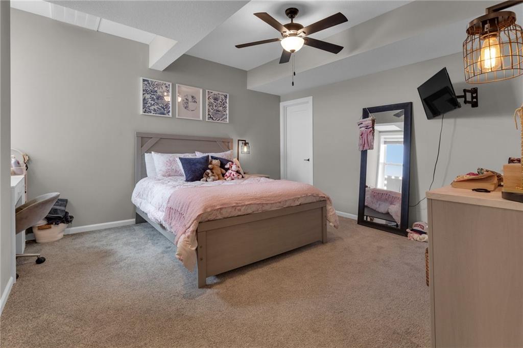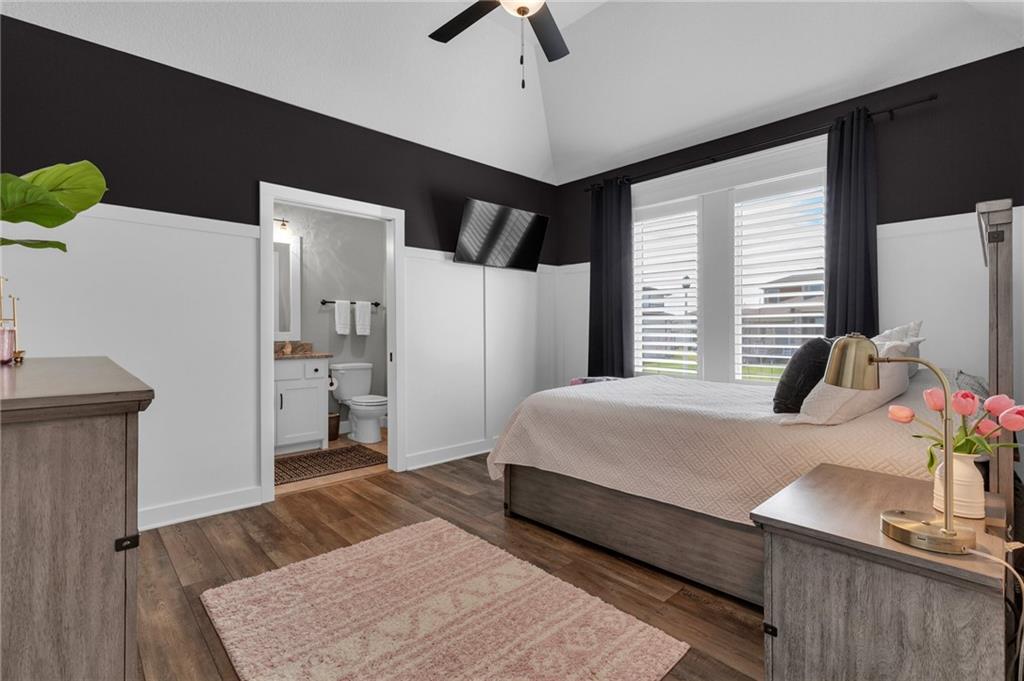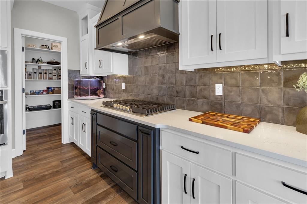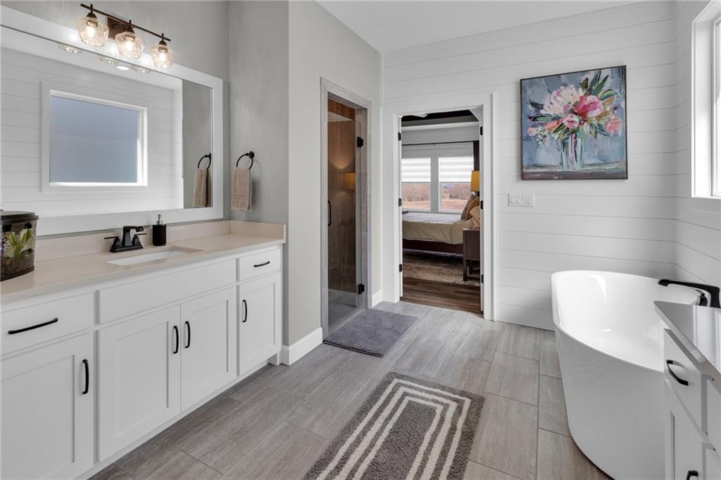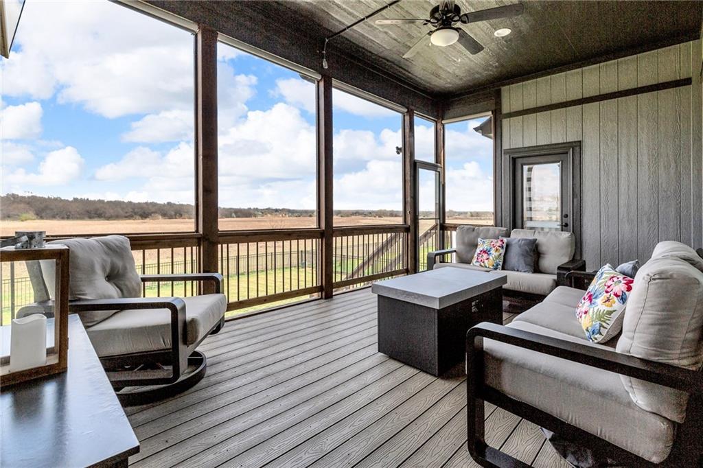 Welcome to 17701 Crystal St in the highly desirable Wolf Run Development! This fully upgraded home offers the option of attending Spring Hill OR Blue Valley School District (open enrollment available per KS House Bill 2567), with schools just 0.7 to 1.7 miles away. This home features 4 or 5 bedrooms (one used as an office) and 3.5 baths, with LVP flooring throughout, plus upgraded carpet in two lower-level bedrooms. The kitchen shines with quartz countertops, a touch-screen oven with built-in air fryer, professional gas cooktop with vented hood, and a vaulted dining area ceiling. Modern window treatments balance privacy and natural light. Step into a fully screened outdoor living space, equipped with professionally installed Sun Shades. The lower-level bath has a glass-enclosed shower, and a tankless water heater ensures endless hot water. The zero-entry master shower boasts two heads and a bench seat for stress relief. The master bedroom features a wood-vault ceiling and private porch access, while the closet offers pull-down rods to maximize storage. The entryway features stunning shiplap and a handcrafted vaulted ceiling, leading to the great room, where wood beams, a vented gas fireplace, and a mantle add warmth and charm. The lower level offers a half kitchen with granite countertops, ample storage, and space for entertainment or game tables. The expanded office includes soundproofing, extra outlets, and an ideal work-from-home environment. The 3-car garage easily fits large vehicles and includes overhead storage for optimal space use. The fully fenced backyard ensures safety for children and pets. A sprinkler system covers all beds and grassy areas, with an easy-to-use programmable system in the garage.