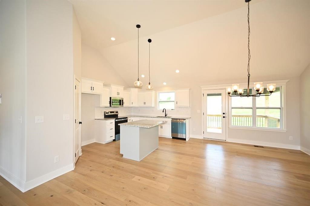 Stunning Custom Home with Modern Features and Inviting Spaces Welcome to your dream home! This exquisite property showcases an open floor plan, ideal for both entertaining and everyday living. The elegant kitchen boasts pristine white granite countertops, custom cabinets, and stainless steel appliances, all seamlessly flowing into the spacious living area centered around a beautiful fireplace. Step outside to discover a covered deck complete with a fan and light, perfect for enjoying serene views of the adjacent pasture. The rich feel of this home is accentuated by LVP throughout and vaulted ceilings enhancing the sense of space and light. The laundry room features stylish tile, while two generously-sized guest bedrooms offer plush carpeting, ceiling fans, and trey ceilings, creating a comfortable retreat for family and friends. The guest bath is tastefully designed, highlighting a tiled tub and a marble vanity that exudes luxury. Retreat to the master bedroom, a good-sized haven with carpet, a ceiling fan, and sophisticated trey ceilings. The walk-in master closet provides ample storage, while the en-suite master bath features elegant tile flooring, a double vanity with sleek black faucets, and a spacious tiled shower. The lower level invites you to enjoy a large fourth bedroom, complete with carpeting and a ceiling fan, alongside a substantial family room perfect for movie nights. The additional full bath boasts a tiled floor and a shower for convenience. Completing this remarkable home is an oversized three-car garage, providing plenty of space for vehicles and storage. The front of the house is adorned with beautiful stone, adding to the curb appeal with shutters to boost the look. Don’t miss the opportunity to make this luxurious yet inviting home your own! SIMULATED PHOTO'S NEW ONES COMING SOON - THE POND IS STOCKED FOR FISHING