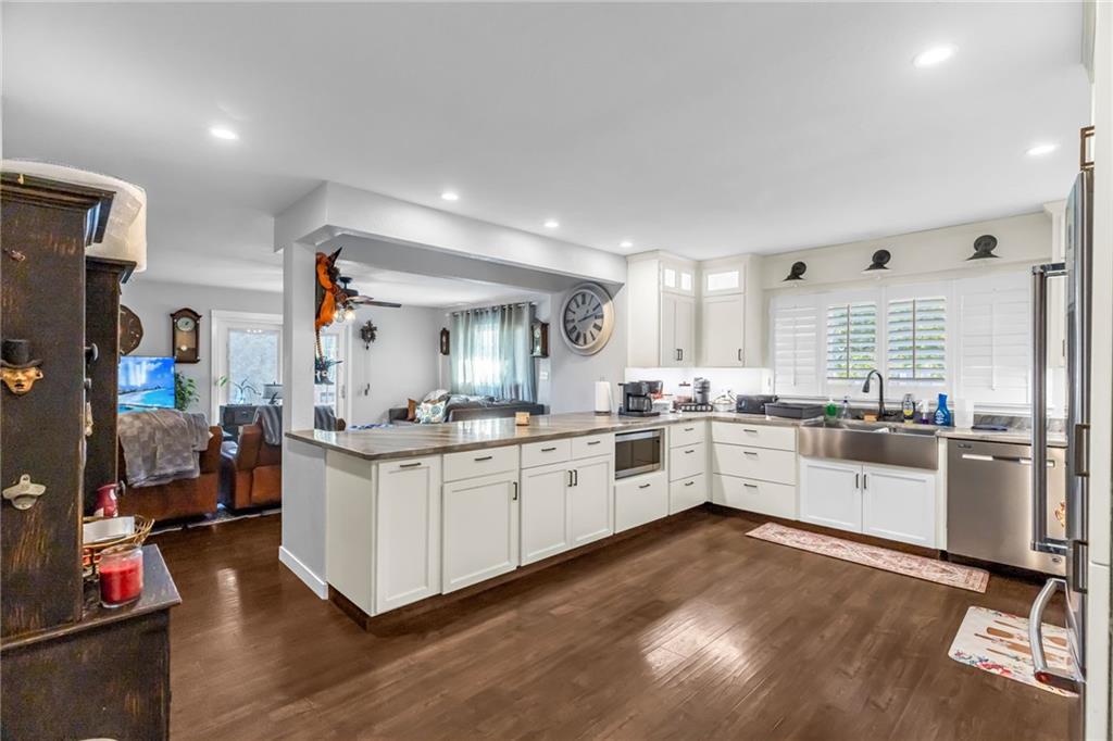 Step inside this fully refreshed ranch where smart design meets stylish living. The open-concept kitchen—transformed in a 2019 renovation—features sleek lighted cabinets (inside and out) and flows seamlessly into the dining and living areas, creating the perfect setting for entertaining and everyday comfort. A brand-new high-impact roof (2024) with matching gutters and downspouts gives this home major curb appeal and long-term peace of mind. Inside, enjoy year-round comfort thanks to the energy-efficient HVAC system (installed 2020). The main floor offers both the Primary suite and guest bedroom, while the lower level adds another bedroom and full bath—perfect for guests, hobbies, or extra living space. This home blends charm, modern upgrades, and Baldwin City convenience—ready for you to move right in and make it your own! Close to downtown shops, dining, and community events!