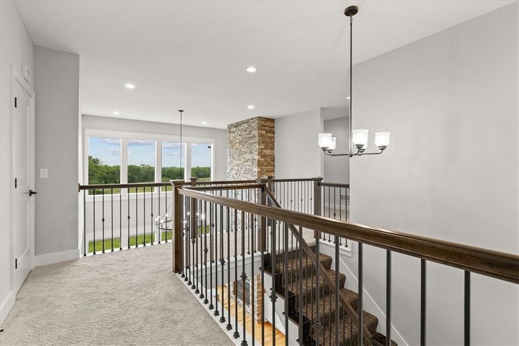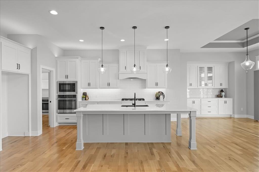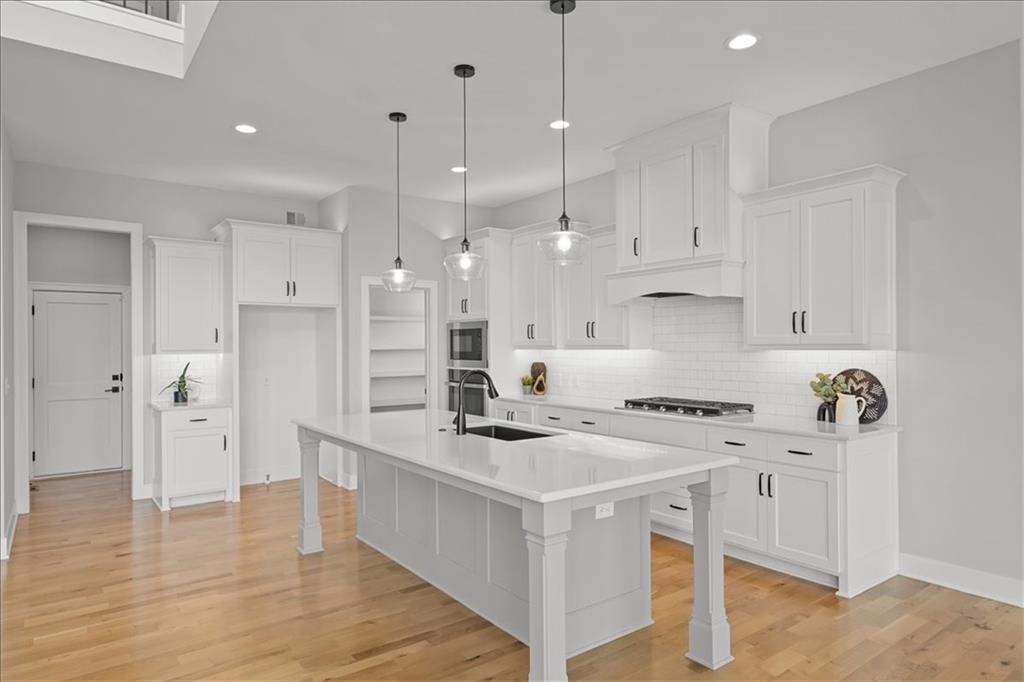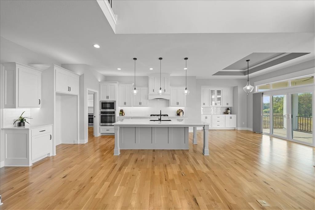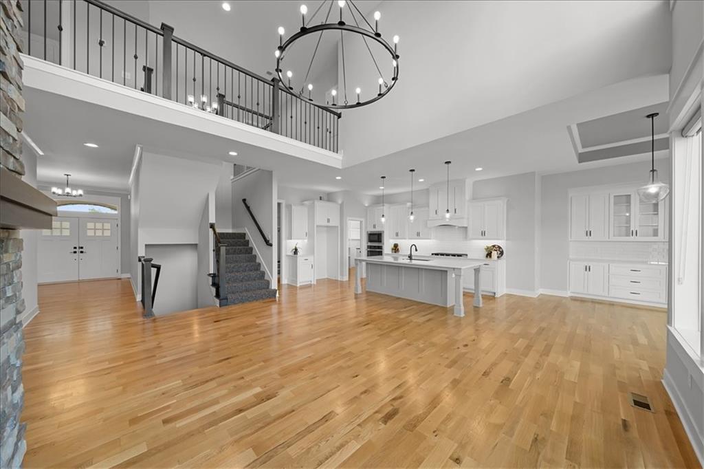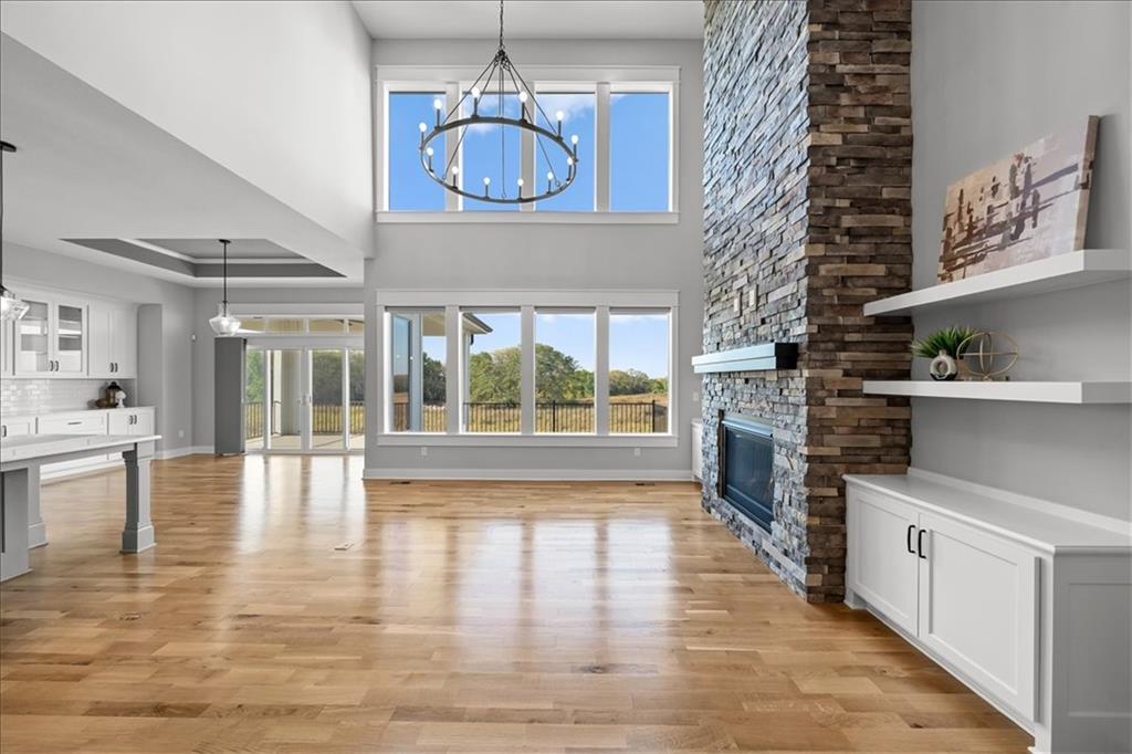 Unbeatable value in the Blue Valley School District! This stunning 1.5-story home is priced nearly $170K below county appraisal and offers exceptional space, style, and comfort. Highlights include a dramatic two-story stone fireplace, wide-plank hardwood floors, and a chef’s kitchen featuring an upgraded gas cooktop, massive walk-in pantry with a second oven, and custom cabinetry throughout. The main-level primary suite is a true retreat with peaceful views, a spa-inspired bath, and convenient laundry hookups just off the bedroom. Upstairs, each secondary bedroom includes its own walk-in closet and private bath for ultimate comfort and privacy—plus a second laundry area for added convenience. The finished walkout lower level expands your living space with a spacious rec room, wet bar, guest suite with ensuite bath, and an additional half bath. Step outside to the expansive, partially covered deck to enjoy beautiful sunsets and serene views. Community amenities include a resort-style pool, clubhouse, and fishing pond—all within minutes of top-rated schools, shopping, and dining. Quick closing available—don’t miss this incredible opportunity!