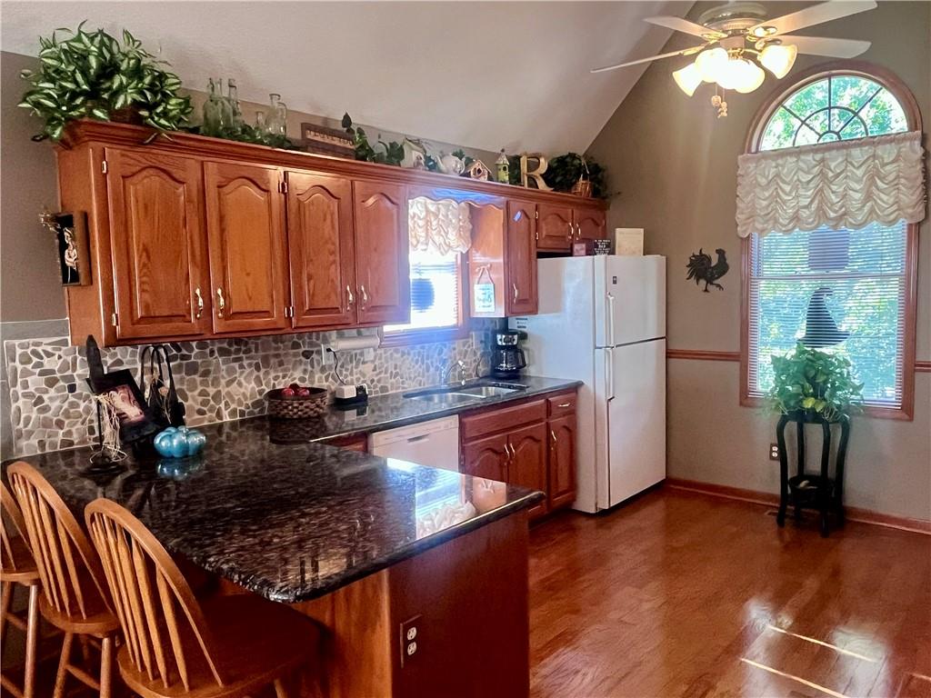 This is NOT your typical split entry and WOW does pride of ownership show throughout the VERY well cared for one owner ALL BRICK custom built home perfectly situated on a nice cul-de-sac fenced lot in a wonderful subdivision close to highway access and so many conveniences. This home offers the perfect blend of comfort, style and functionality! Step inside to a large tiled entryway then up to the spacious living room and updated kitchen that offers TONS of cabinets and counter space, a breakfast bar, beautiful granite countertops, a gorgeous stone/tiled backsplash gleaming hardwood floors and a huge dining/hearth area with a see through fireplace from the dining into the living room. The perfect space for everyday living and entertaining. The very generous sized master suite has a nice vaulted ceiling, ceiling fan and a large walk-in closet, jetted tub and separate shower in the bath. Bedrooms 2 and 4 also have walk-in closets. Newer carpet throughout. Nicely finished handicap accessible, walk-out basement with a 4th bedroom, large full bath and an additional family/entertainment room. Roof is approximately 5 years new and HWH 4 years. A must see!