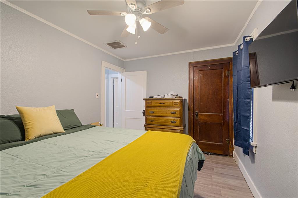 Bedroom featuring a textured wall, ornamental molding, wood finished floors, and ceiling fan