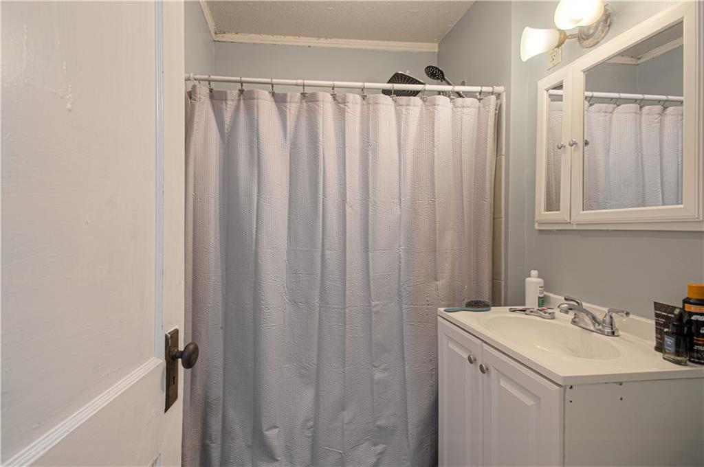 Bathroom featuring curtained shower, vanity, and a textured ceiling