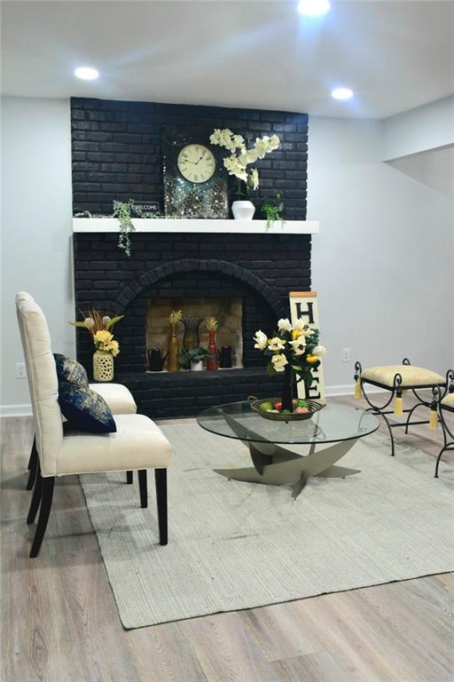 Living area with a brick fireplace, wood finished floors, and recessed lighting
