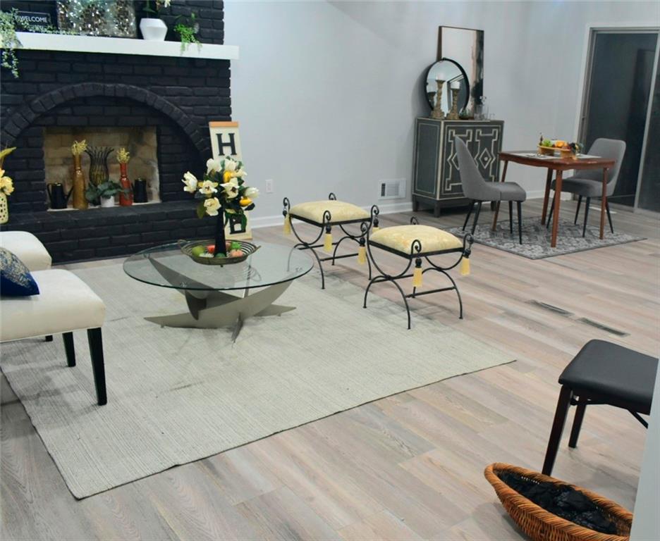 ??Open-plan living/dining area anchored by a classic brick fireplace and illuminated by bright, light-toned hardwood flooring.