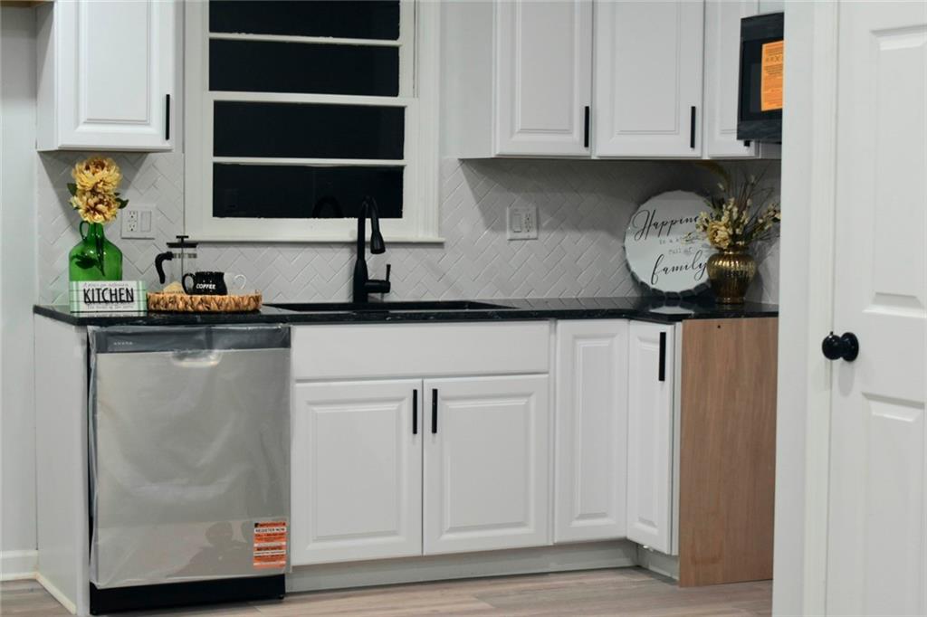Kitchen with white cabinetry, decorative backsplash, dishwasher, and dark stone countertops