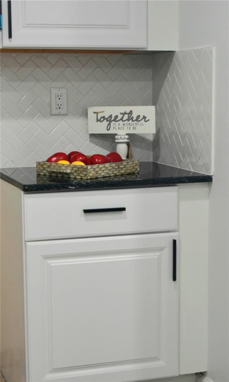 Kitchen with white cabinetry, dark stone counters, and decorative backsplash