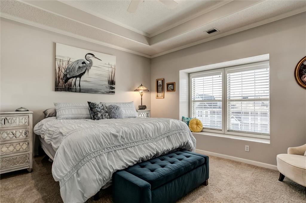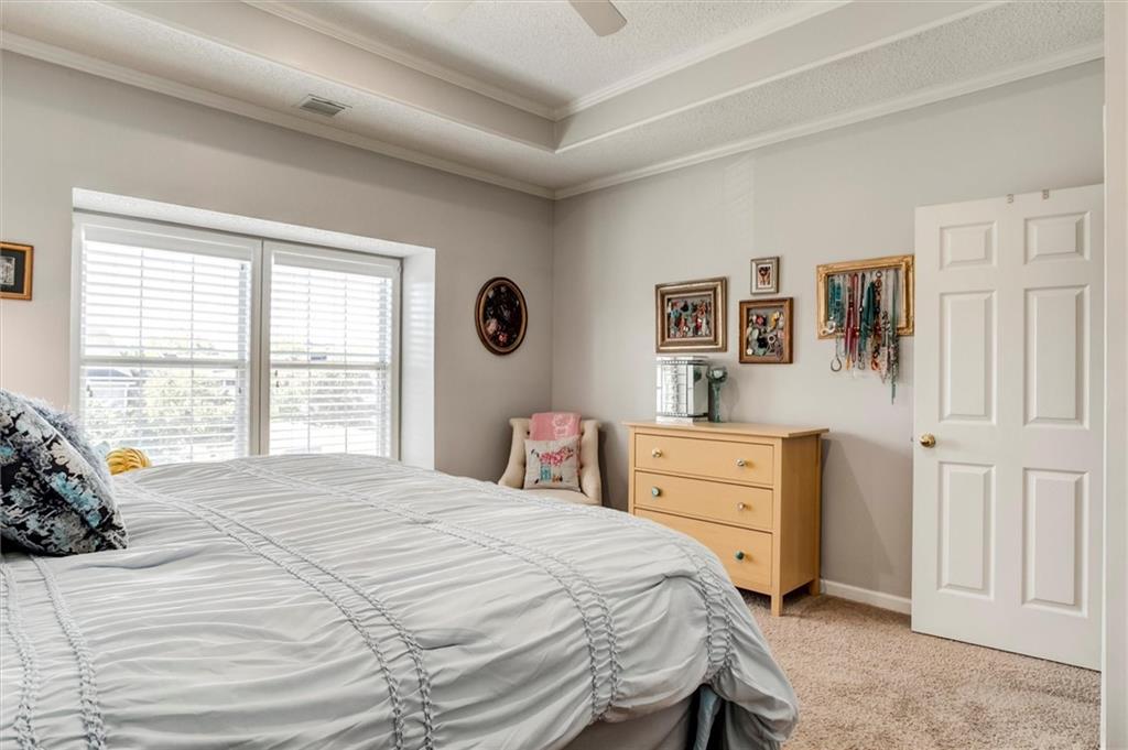Drastically reduced! Maintenance-Free Living at Its Best! Enjoy effortless living in this beautifully maintained ranch home perfectly located with an attached garage, covered deck, and a partial lake view. The open floor plan features spacious rooms, neutral décor, and abundant natural light throughout. A welcoming vaulted, tiled entry opens into a bright living room with a cozy gas fireplace, ideal for relaxing or entertaining. The fully applianced kitchen offers extensive cabinetry, generous counter space, and room for casual dining—or host guests in the formal dining room. The primary suite is a true retreat, showcasing a coffered ceiling with fan, an en-suite bath with dual vanities, separate tub and shower, and a walk-in closet with custom shelving and split rods. The second bedroom overlooks the front yard and features a vaulted ceiling and large closet. Additional highlights include a large pantry, laundry room with washer and dryer, and convenient access to the basement featuring a finished flex room—perfect for a den, hobby space, or workshop—plus ample storage. Set within a well-managed community, residents enjoy outstanding amenities including a clubhouse with party room, in-ground pool, walking paths, and a scenic lake with catch-and-release fishing. The HOA covers all exterior maintenance—roof, lawn care, landscaping, snow removal, water, and exterior insurance—for true, maintenance-free living.
