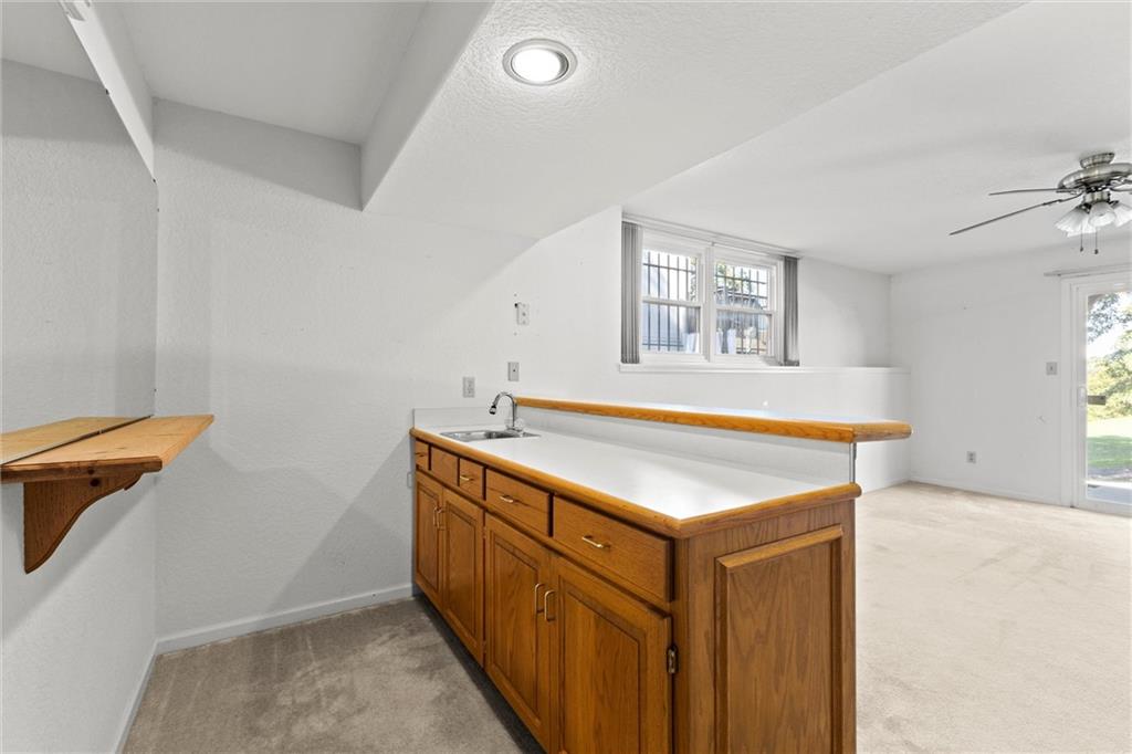Maintenance free living at Teetering Rocks Golf Course. Eat-in kitchen with hardwood cabinets and custom built-ins. Stainless/black kitchen appliances stay with property. Living/dining room feature fireplace and level walk out deck with golf course views. Main level laundry room in hallway. Main level primary bedroom features ensuite bath and large walk-in closet. Endless possibilities on lower level featuring second bedroom, full bath, large walk-in closet, recreation room with wet bar, walkout patio and storage room. Low HOA dues cover lawn mowing, fertilizing, watering, leaf removal, snow removal and exterior painting. This neighborhood has an awesome entertainment committee that organizes driveway parties, parades, outdoor games in the common areas, ladies and men's lunches, monthly dine-outs and many other activities if interested. Close to shopping, dining, entertainment,hospitols and highway access.