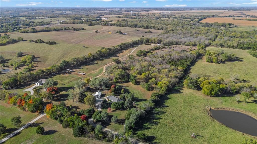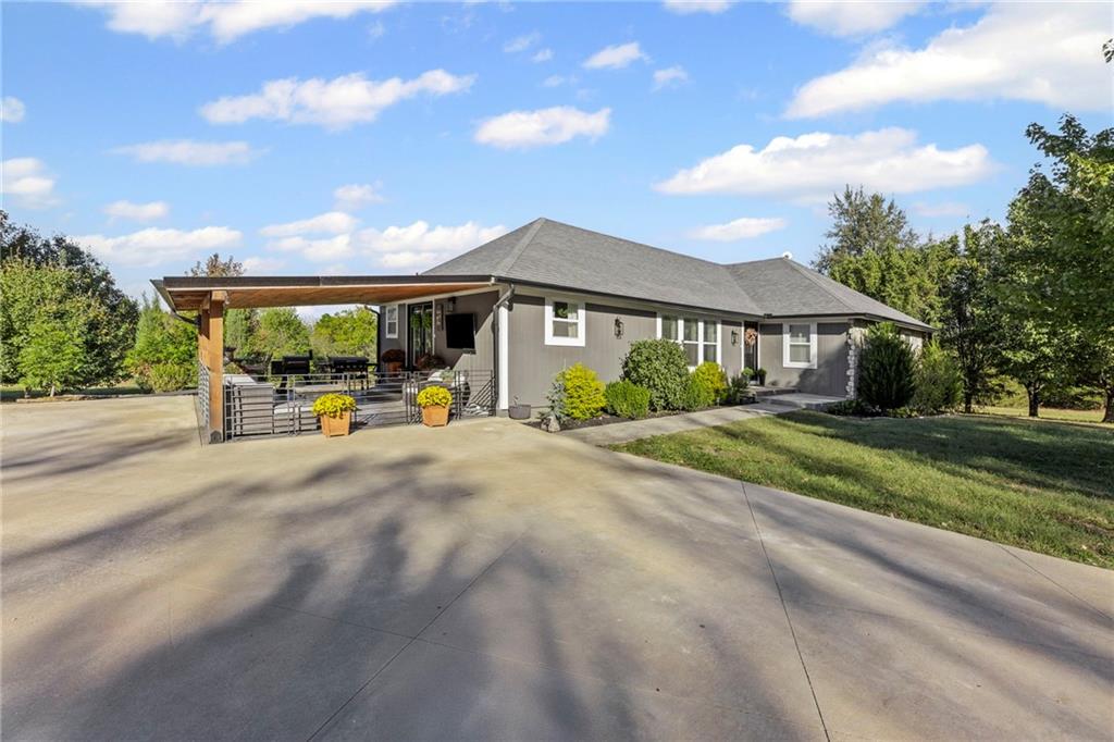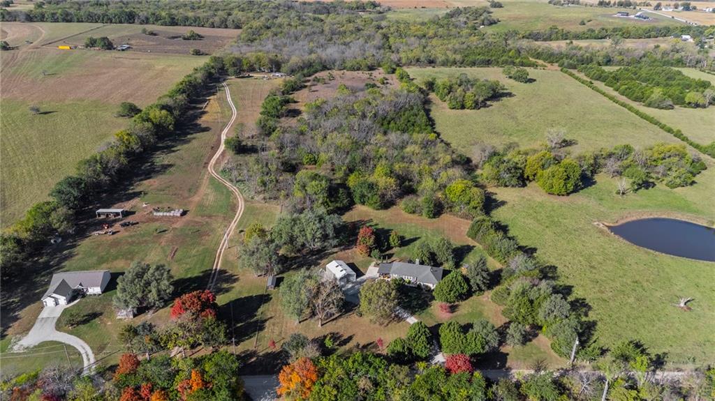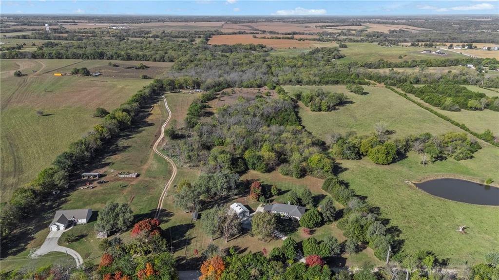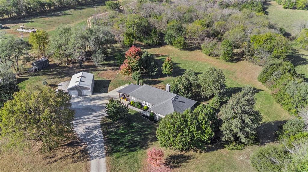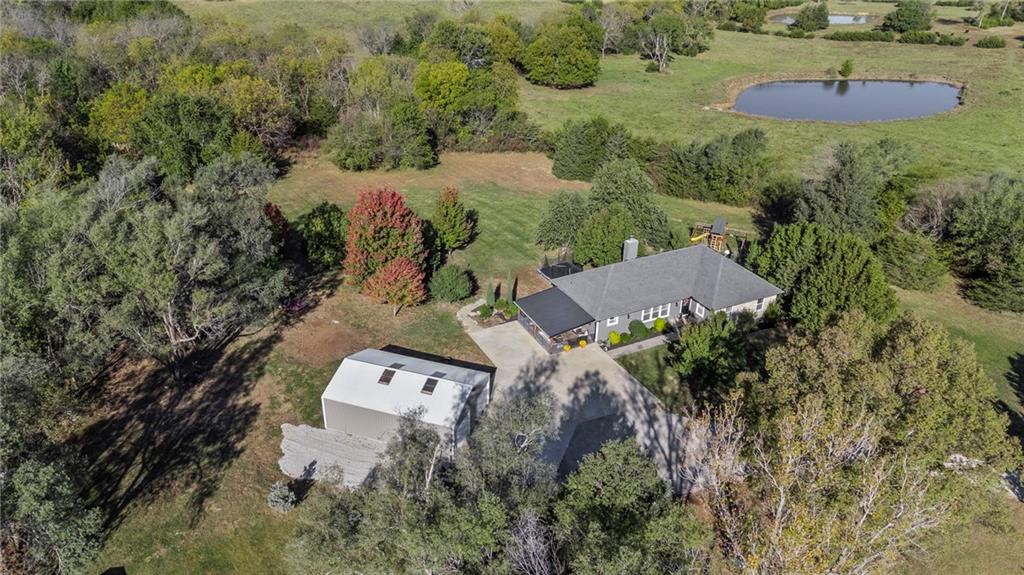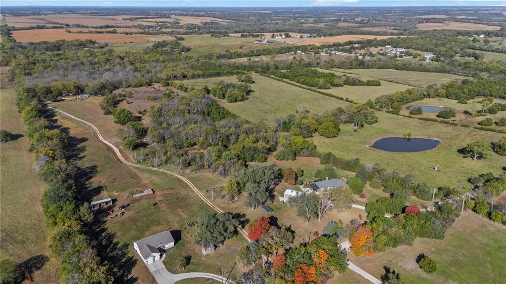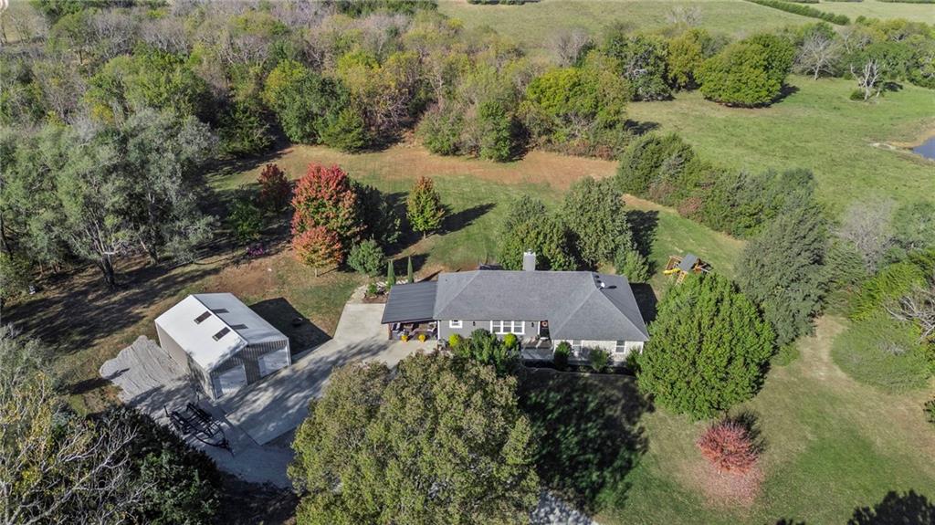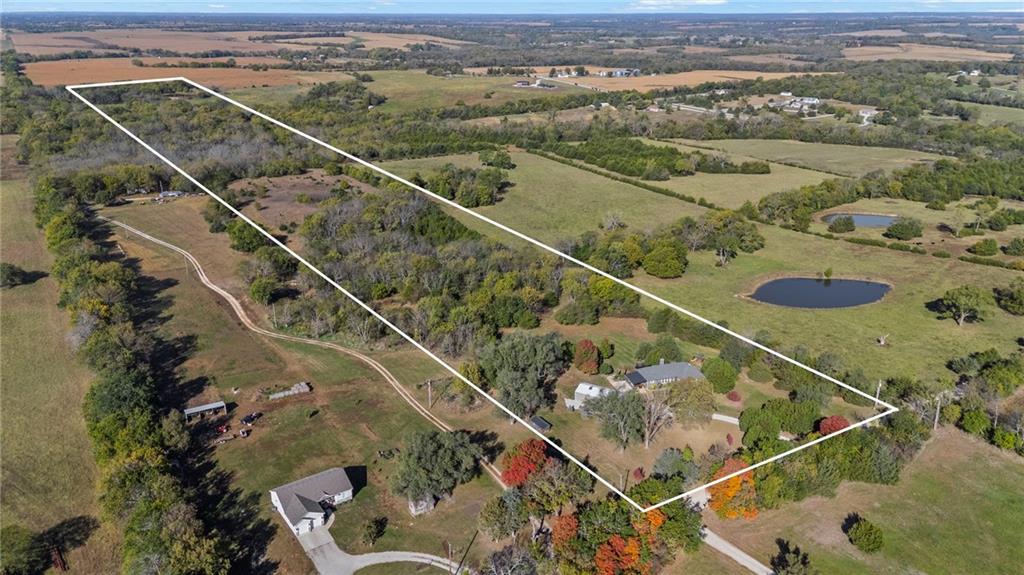 This exceptional property is a true country lover's dream, offering a stunning 5 bedroom, 3½ bathroom ranch home nestled on approximately 20 +/- acres of picturesque land, perfectly blending rustic appeal with modern comfort. The interior features a spacious, open-concept living area ideal for both relaxing and hosting, anchored by a chef's kitchen boasting ample cabinetry, granite countertops, a breakfast bar, and stainless-steel appliances, which flows seamlessly into the dining room. A warm stone wood-burning fireplace highlights the cozy great room. The main level includes a generous primary suite with a walk-in closet, double vanities, and a tiled bathroom, alongside two more bedrooms and a full bath. Adding incredible versatility, the finished walk-out lower level features a huge family room with an impressive wet bar, two additional spacious bedrooms, a second laundry room, and a workout room that could easily revert to a third-car garage space. Basement has safe and sound insulation for sound proofing. Outside, enjoy glorious sunrises and rolling views from the lovely covered patio, overlooking timber, a pond for fishing, and abundant wildlife, including deer and turkey. 1 car attached garage and 2 detached spaces in the valuable 24x36 outbuilding with a concrete floor and electricity completes this magnificent setting. Close to Hillsdale Lake, with riding trails, boating, fishing, and camping!