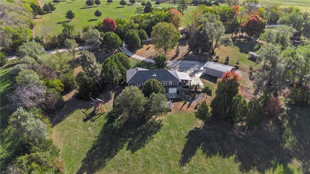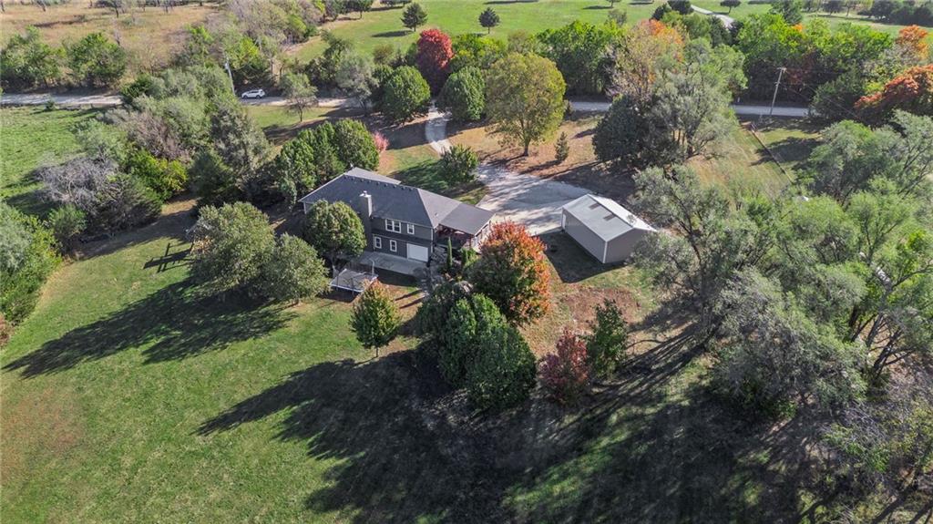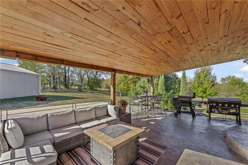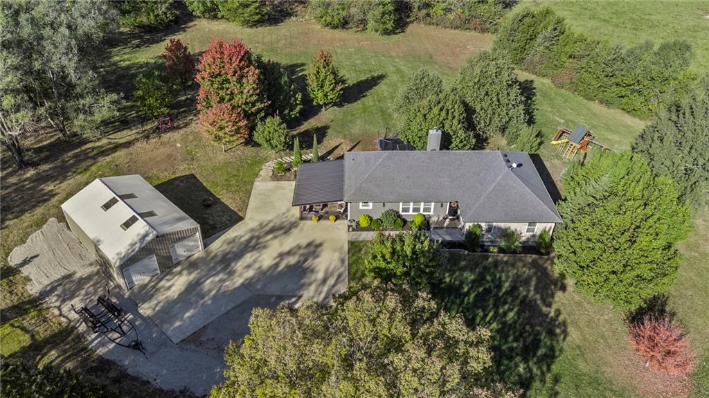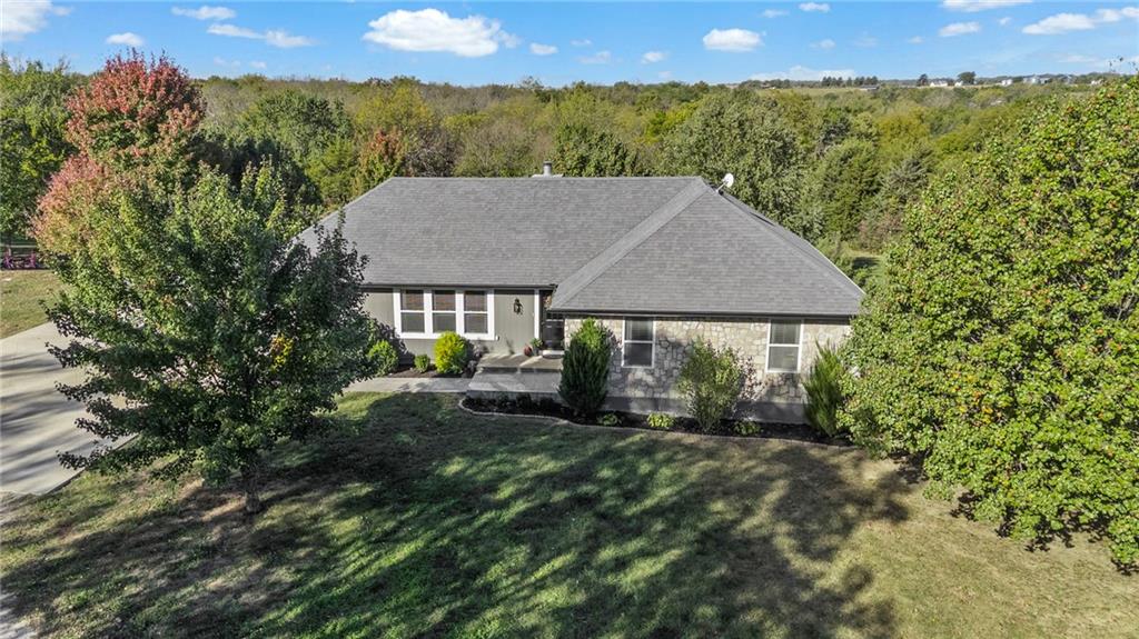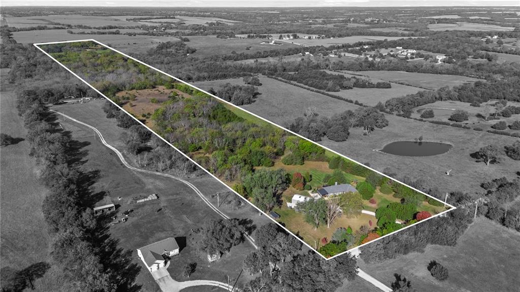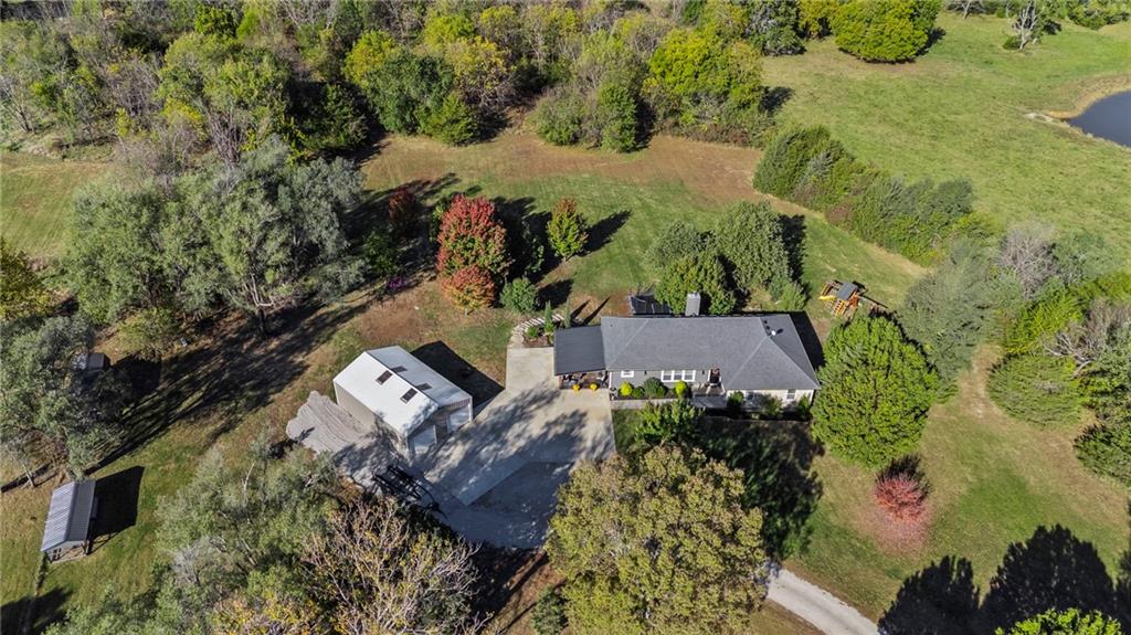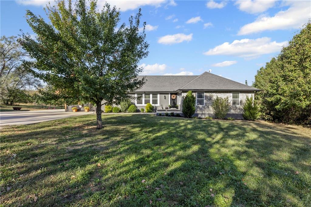 This exceptional property is a true country lover's dream, offering a stunning 5 bedroom, 3½ bathroom ranch home nestled on approximately 20 +/- acres of picturesque land, perfectly blending rustic appeal with modern comfort. The interior features a spacious, open-concept living area ideal for both relaxing and hosting, anchored by a chef's kitchen boasting ample cabinetry, granite countertops, a breakfast bar, and stainless-steel appliances, which flows seamlessly into the dining room. A warm stone wood-burning fireplace highlights the cozy great room. The main level includes a generous primary suite with a walk-in closet, double vanities, and a tiled bathroom, alongside two more bedrooms and a full bath. Adding incredible versatility, the finished walk-out lower level features a huge family room with an impressive wet bar, two additional spacious bedrooms, a second laundry room, and a workout room that could easily revert to a third-car garage space. Basement has safe and sound insulation for sound proofing. Outside, enjoy glorious sunrises and rolling views from the lovely covered patio, overlooking timber, a pond for fishing, and abundant wildlife, including deer and turkey. 1 car attached garage and 2 detached spaces in the valuable 24x36 outbuilding with a concrete floor and electricity completes this magnificent setting. Close to Hillsdale Lake, with riding trails, boating, fishing, and camping!