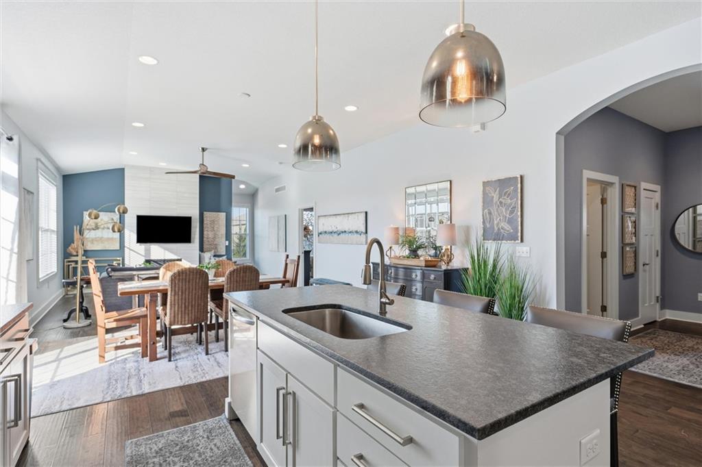 Exceptional Move-In Ready Townhome! This stunning 3-bedroom, 3-bath reverse 1.5-story home offers a fabulous open-concept floor plan perfect for modern living. The spacious living room features beautiful hardwood floors, a cozy gas fireplace, and an adjoining dining area that opens to a private patio surrounded by lush, professional landscaping. The light and bright kitchen is a chef’s dream, boasting a gas range, large island, soft-close cabinetry, and a large walk-in pantry. The primary suite offers a walk-in closet and convenient access to the laundry room, while a guest bedroom is also located on the main floor for easy living. The finished lower level provides a generous family room, third bedroom, full bath, and over 400 sq. ft. of storage space. Notable upgrades include ceiling fans, pendant lighting, shutters, a lighted stairwell, HDMI/CAT5E wiring, enlarged patio, outlets in the pantry, taller toilets, soft-close doors and drawers, laminate flooring in the lower level, and additional landscaping. The HOA covers all exterior maintenance and roof, lawn care/trimming/mulch, snow removal, trash, and water service, plus access to community amenities including a swimming pool, walking trails, basketball court, sand volleyball courts, and playground. Fantastic location close to top-rated schools, parks, and easy highway access!