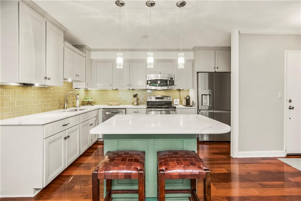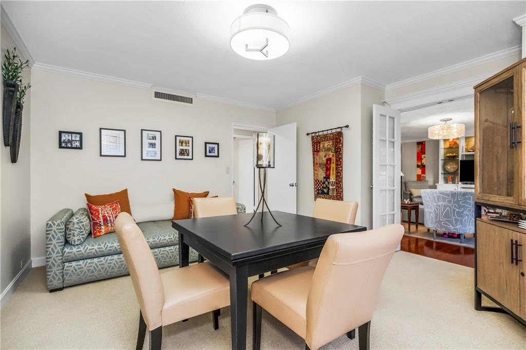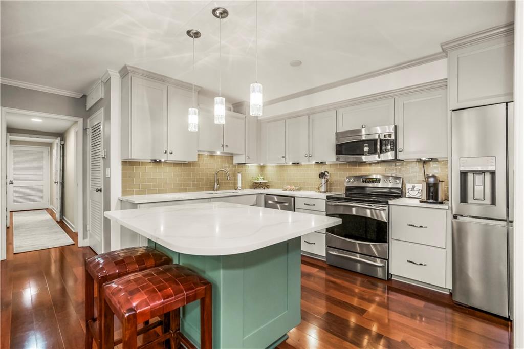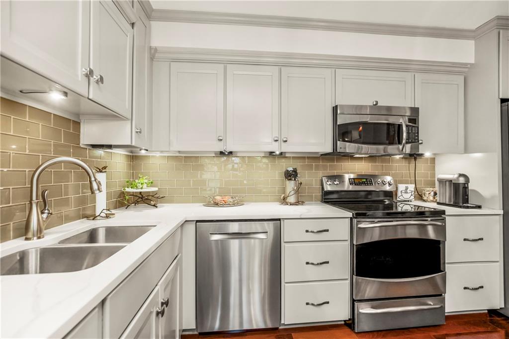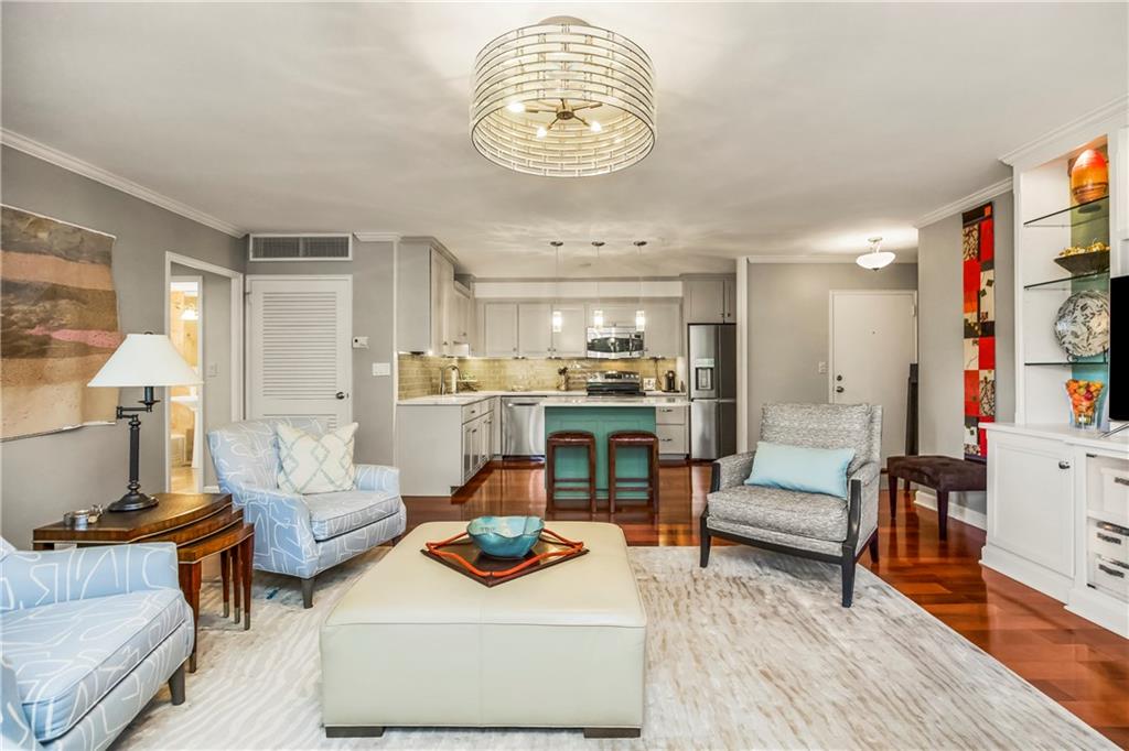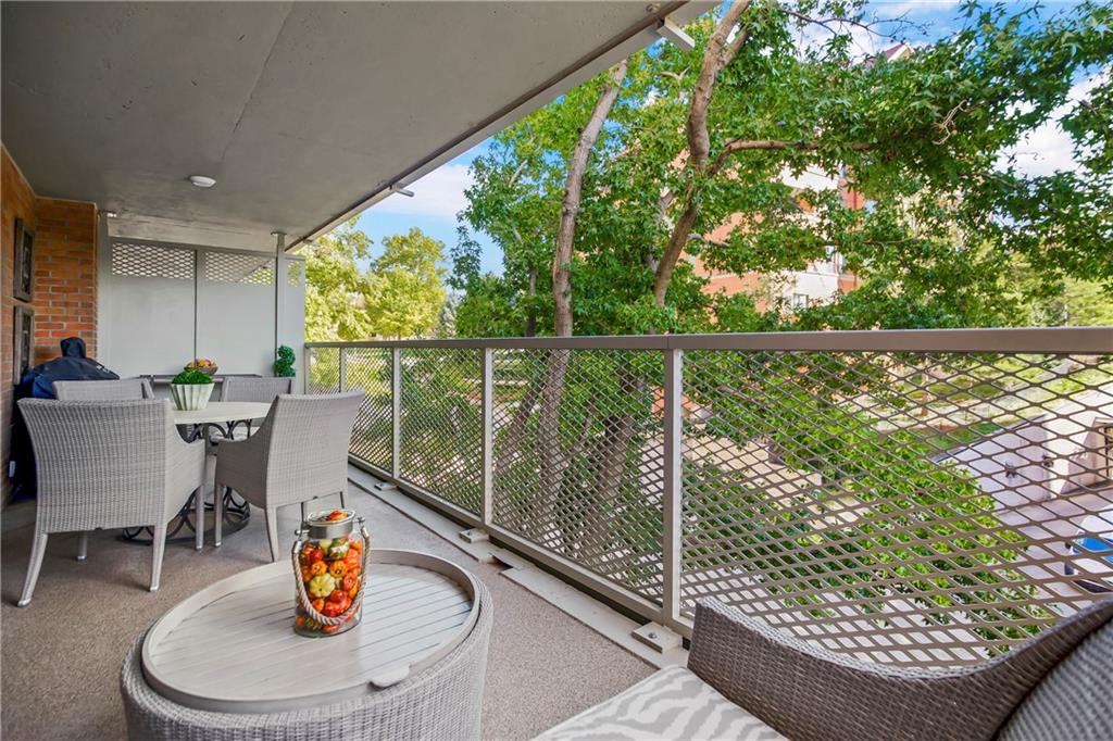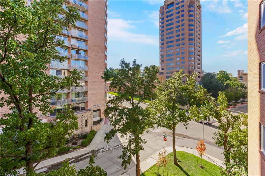 Absolutely stunning South facing unit offers open fl plan with beautiful cherry floors. well-designed open kitchen with quartz countertops, island and stainless appliances, under cabinet lighting and electric outlets for sleek backsplash, Walk in pantry, cabinet roll outs, soft close drawers, fixtures, can lighting, newer windows & sliding dr leads to large treed balcony with Hunter Douglas blinds to allow light and privacy. beautiful built in's living rm, french doors from liv to bedroom, wlk-in closet in primary bedroom, large walk-in shower in primary bath, Comes with one parking space that can be rented approximately $100 mo. Laundry room, party room and exercise room in common areas. leisurely walk to Plaza, Loose Park, entertainment, restaurants and more. BEST PRICE PER SQUARE FOOT ON THE PLAZA. HOA INCLUDES YOUR PROPERTY TAXES!!! $100 PARKING FEE INCLUDED IN $1815 HOA FIGURE ON LISTING