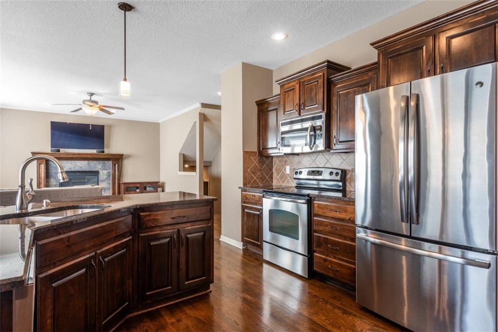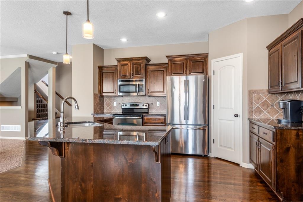Pretty as a Picture & Better Than New! This stunning 2-story home has all the bells and whistles you’ve been searching for! From the moment you step inside, you’ll fall in love with the open floor plan, spacious living areas, and stylish finishes throughout. The heart of the home is the gorgeous kitchen, featuring gleaming granite countertops, a huge center island, beautiful hardwood floors, and upgraded lighting that adds warmth and character. The kitchen flows seamlessly into the living and dining areas, making it perfect for entertaining family and friends. Upstairs, every bedroom includes a walk-in closet, offering plenty of storage for everyone. The impressive master suite is truly a retreat — complete with a massive walk-in closet, double vanity, 5-foot soaker tub, and a luxurious tiled walk-in shower. You’ll love unwinding here after a long day. The home’s thoughtful upgrades continue throughout — including 2 ½" faux wood blinds, designer carpet on the stairs, upgraded switches and light fixtures, and a mudroom with a built-in hall tree and desk for easy organization. Step outside and enjoy the fenced backyard, perfect for kids, pets, or outdoor gatherings. The front and back sprinkler system keeps the lawn looking lush year-round. Recent updates make this home truly move-in ready: new interior paint, exterior paint just two years old, and a new class 4 roof installed last year for peace of mind (class 4 is usually cheaper for insurance). Tech enthusiasts will appreciate the upgraded wiring with dual Ethernet runs in both the living room and master bedroom — ideal for working from home, streaming, or gaming. Located in a prime area, this home is close to shopping, restaurants, Ernie Miller Nature Center, Lake Olathe, and just minutes from Olathe West High School.