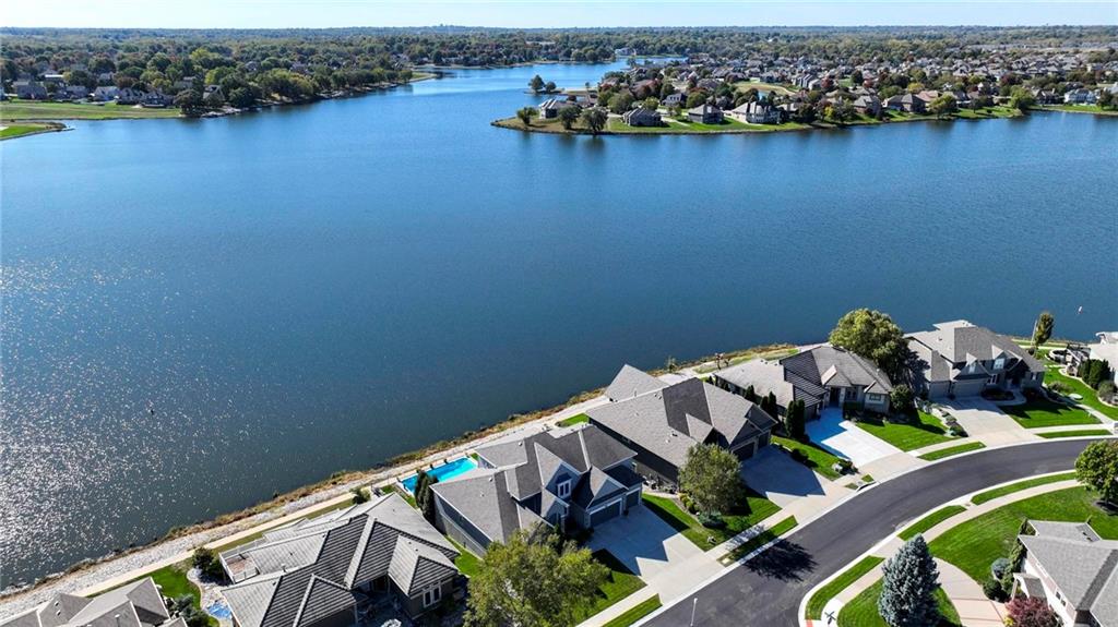 Exceptional custom home designed with entertaining in mind. Stunning walnut floors from the gracious entry, through the great room, kitchen & breakfast room. Great room has vaulted ceiling, gas fireplace in stone accent wall, built-ins & floating shelves. Kitchen has large island, top of the line appliances including built-in Frigidaire Professional refrigerator/freezer, cooktop with vented hood, dbl oven, microwave & dishwasher. Pantry is 5x16 with built in desk under window, tons of shelf space. Breakfast nook is ideal for banquet, full glass door out to Lanai, vaulted ceiling, ceiling fan. Bonus main level family room has 19' bar w/custom cabinets, granite counters, stone walls behind bar, 2nd 15' long serving bar with tons of storage, granite countertop & mid century design. Family room has 15' vaulted ceiling with tongue & groove ceiling & beams. A beautiful den space, or room for baby grand piano, under the beautiful fixture plus additional dining space surrounded by windows & door out to large covered Lanai with tile floor. The primary suite is large with vaulted ceiling & luxury bath with separate vanities, very large tiled shower, dream 10x18 walk-in closet with large dresser island, walks through to laundry. Staircase to lower level with custom glass panel railing, large windows flooding the stairway with natural light. Large family room with wet bar area with tiled floor. 1 guest suite with bath & large walk-in closet, 2 additional bedrooms have walk-in closets, each with private vanity spaces, share shower. 1 bedroom has a secret passageway through built-in bookcase, to 8x9 storm area/storage under front porch! New covered patio off lower level family room is 20x13. Car lovers, a bonus 4th garage, has driveway from main level, is 22'd x 19'w. The main level 3 car garage is oversized, 31'wide, with 11' ceiling, 2 car side is 24'deep, 1 car side 29'deep with 9' wide door. North Shore is Cass County, Lee's Summit Schools.