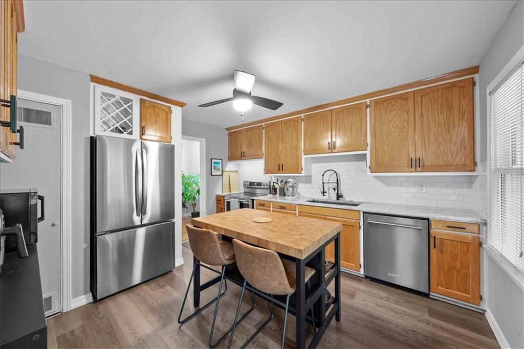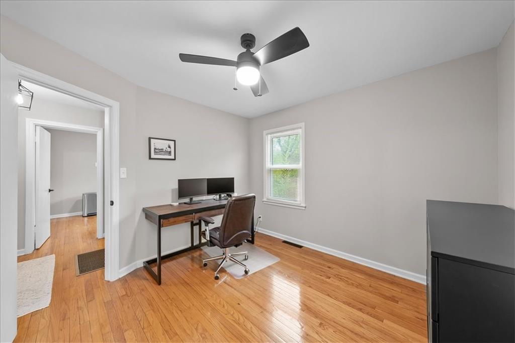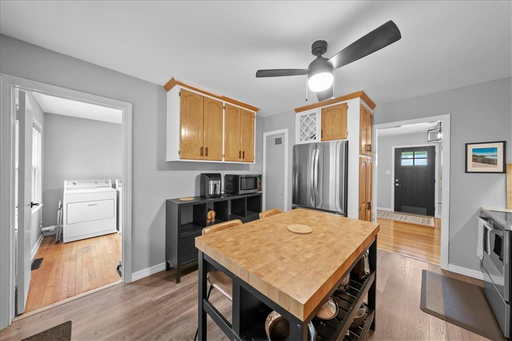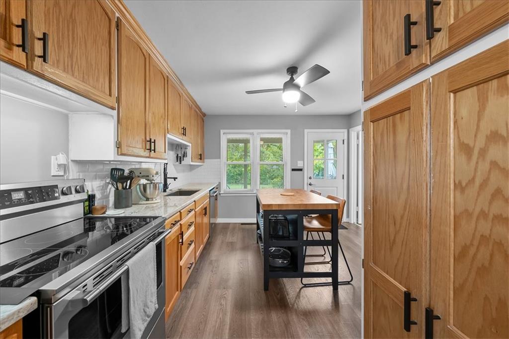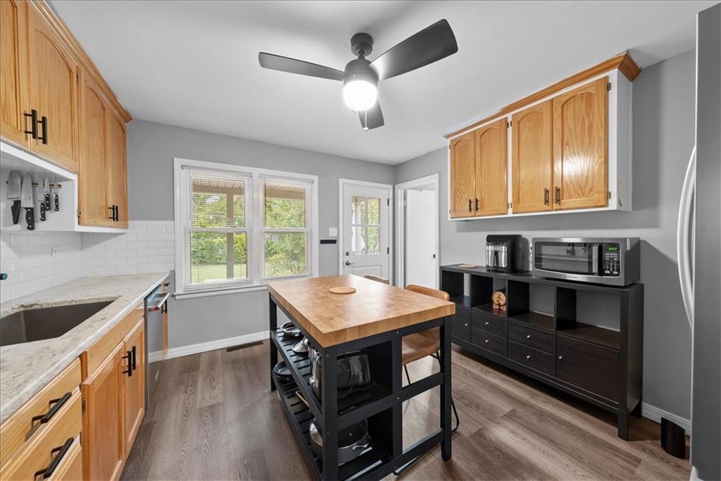Welcome home to this Prairie Village charmer! Step into a classic ranch which boasts gleaming hardwood flooring in the living area and bedrooms that will immediately grab your attention. The large living area even has room for a dining table or would be a perfect reading nook. Next, an eat-in kitchen features newer stainless steel appliances (all stay), granite counter tops, an oversized sink, new vinyl plank flooring, and loads of cabinet space. All bedrooms are good sized, and the primary is large enough to accommodate a king-sized bed. The interior of the home has been freshly painted, and all light fixtures and ceiling fans have been updated. The third bedroom does have a laundry hook-up, but there is an additional hookup in the utility room off of the garage. Front and back doors have been recently replaced, and the new shutters, low-maintenance siding, and front stone accent all add to the attractive curb appeal. If you are seeking a large fenced yard, look no further! The patio has direct access from the kitchen and adds a private retreat or outdoor living space to host your gatherings. This home is conveniently located to all your favorite spots in PV, and only a short drive to downtown KC. Don't let this opportunity slip away!