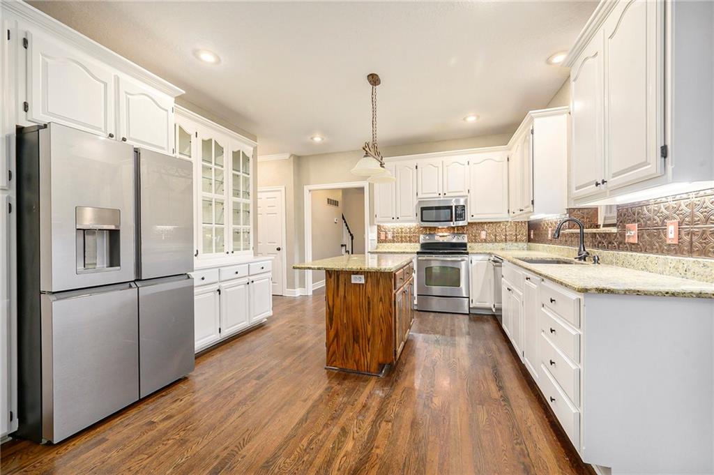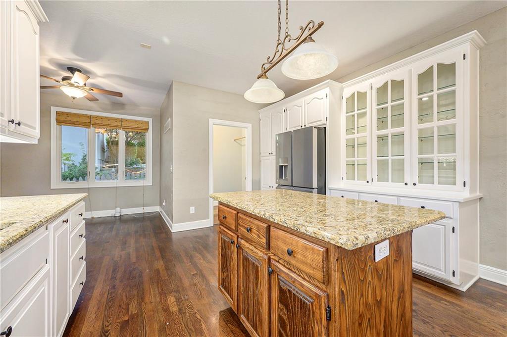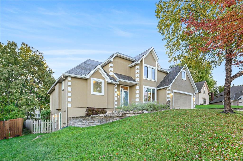 Beautifully updated and well-maintained 1.5-story in Hills of Walden offers generous space, thoughtful updates, and community appeal. The main level features original hardwood flooring, a bright kitchen with granite counters, center island, pantry, and newer stainless refrigerator & dishwasher. The main level primary suite includes a tray ceiling, updated carpet, and a bath with dual vanities, soaking tub, and separate shower. A formal dining area opens to a spacious great room with fireplace and large windows overlooking the fenced backyard. Upstairs, three additional bedrooms and a full bath complete the upper level. The finished walk-out basement adds exceptional versatility with a fifth bedroom, non-conforming sixth room ideal for office or guest use, full bath, and rec area with tiled floors and walk-out access to a stone patio. Recent improvements include full interior paint (2025), new roof (Summer 2025), newer AC and water heater, and mud jacked driveway & walkway. Outdoors, enjoy a large refreshed deck and fenced yard with mature trees—perfect for outdoor gatherings. Located on a cul-de-sac within a sought-after HOA offering pool, clubhouse, and tennis courts, this home combines comfort, updates, and convenience in one functional layout. Nearby Amenities Hills of Walden community clubhouse, swimming pool, and tennis courts within subdivision. Convenient access to Barry Road and I-29 corridor shopping including Hy-Vee, Target, and Zona Rosa (approx. 10 minutes). Line Creek Trail and Line Creek Community Center located within about one mile. Easy highway access via NW 64th Street/I-29 interchange (approx. 1.3 miles). Variety of dining and service options within a 1-mile radius along Barry Road and Congress Avenue. Located in the desirable Park Hill School District!