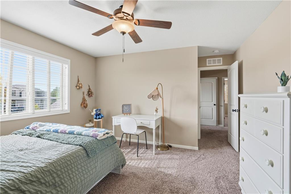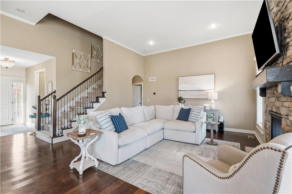 Beautiful "Cherry Creek II" plan by Summit Custom Homes. This 1.5 story plan in Falcon Valley features a spacious primary bedroom & bath on the main level. Also, on the main level you'll find the kitchen, vaulted great room w/see through fireplace, breakfast room, an office, laundry room, and all of this charm steps out onto a covered patio w/tons of beautiful landscaping to enjoy & relax within. Upstairs, there are (3) ample sized bedrooms w/2 full baths. In the lower level, you'll get to experience the comfortable ambience of the beautiful rec room w/Bar as well as a (5th) bedroom and 4th full bath. This home has been lovingly maintained and lived in by the original owners. Exterior was just painted, new carpeting on the stairs and in main level office. This gorgeous house sits upon a cul de sac lot w/access to the sidewalks for walking your dog or just taking a leisurely stroll. Great location in Lenexa. Close to highways, schools, dining and more.