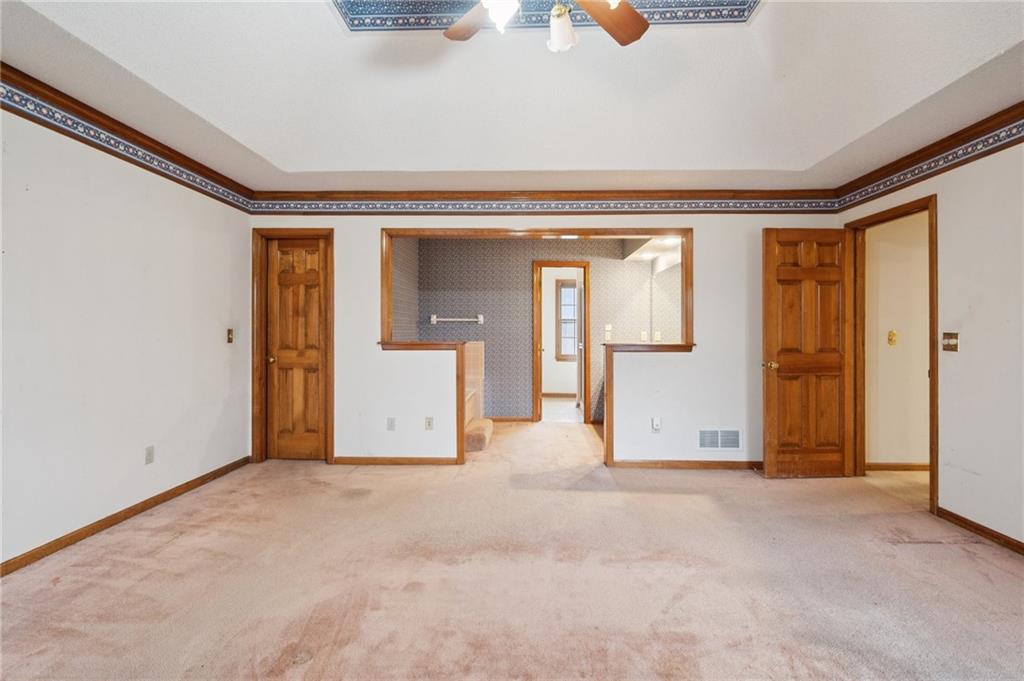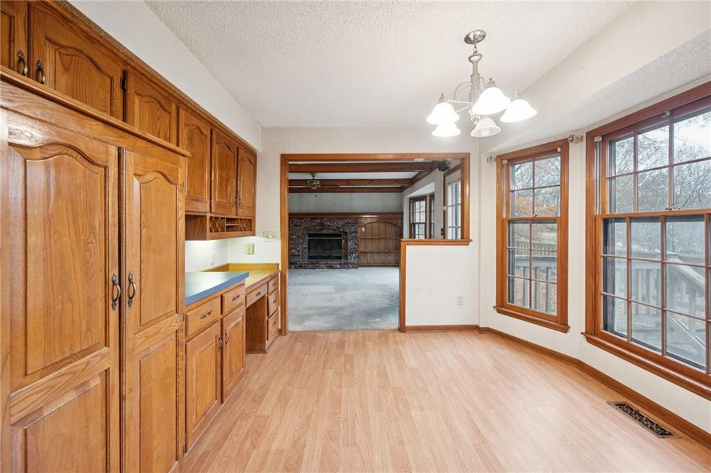 Bring your design inspiration to this two story home with great potential in popular Lenexa location, walking distance to grade school, city park, and shopping! HOME IS ON A WALK OUT LOT BACKING TO GREENSPACE! Exterior has been recently painted, plus newer roof, HVAC, and hot water heater. All of the big items are taken care of! Finish the basement and add even more living space. If you work from home, you'll love the office on main floor, plus a formal dining room that could provide a second office! Beautiful bay windows, wet bar in Great room, laundry on bedroom level. Enjoy sunrise with your moring coffee on the deck, and afternoon shade for your dinner grilling, overlooking a spacious back yard! HOME IS BEING SOLD AS IS.