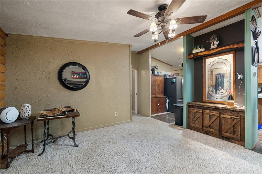 Welcome to your own private retreat on 20 beautiful acres! This log-sided manufactured home is nestled among rolling hills and mature timber. The land is mostly wooded, with a seasonal creek that runs at the bottom of the first hill — flowing during heavy rains. The property is partially fenced with barb wire along the sides and back. Step inside to find 3 spacious bedrooms and 2 full bathrooms. A formal living room greets you at the front of the home, leading into an open-concept kitchen and cozy family room. Home has newer vinyl plank tile. The pellet stove adds warmth and charm while helping reduce propane costs during the colder months. There is a central all-in-one electric heating and cooling system as well.. The home also features a durable metal roof for long-term peace of mind. Enjoy the outdoors from the large back deck, part of which is enclosed and currently used as a small workshop. Additional features include a 30-amp RV hookup, a second septic system near the campsite area, and a blue connex container with its own 200-amp electrical service—perfect for storage or future expansion. Whether you're looking for a full-time residence, weekend getaway, or hunting basecamp, this property has endless potential. This property qualifies for free deer tags every year.