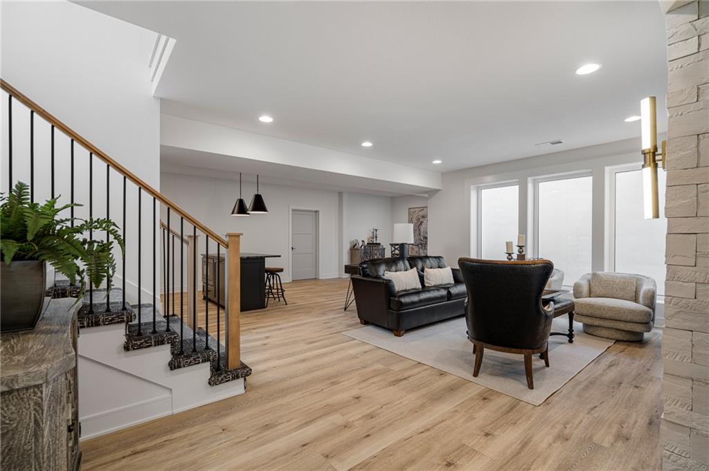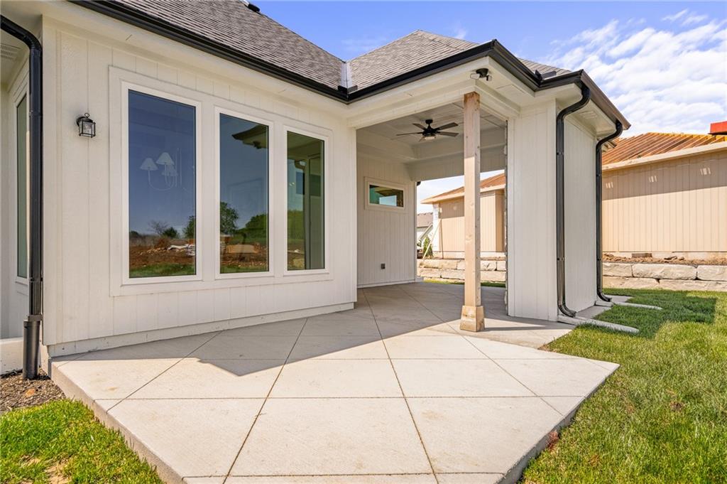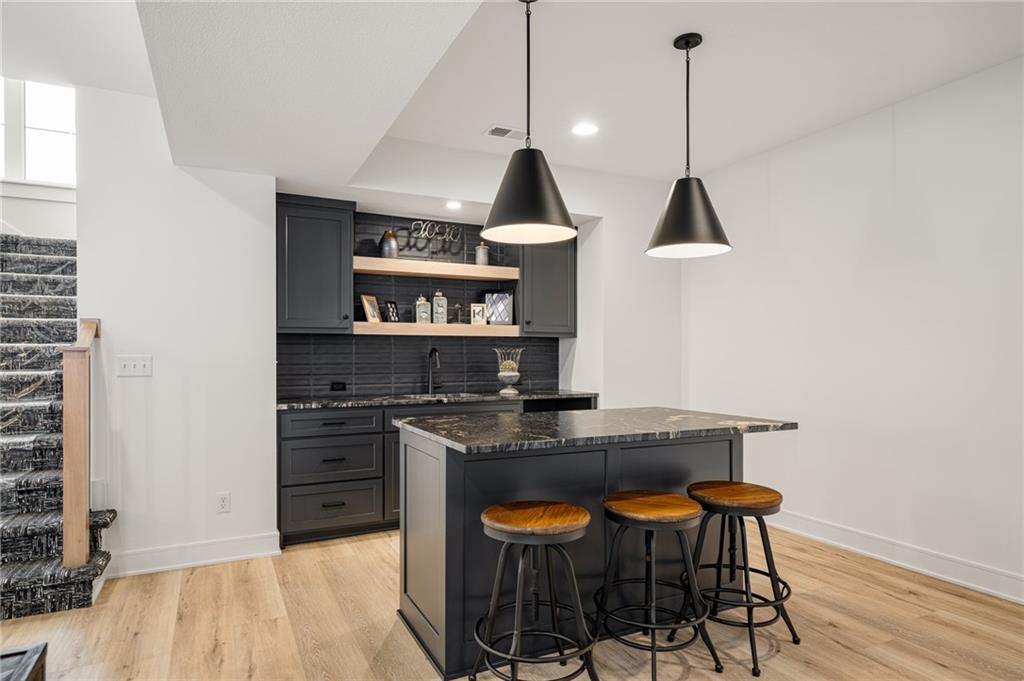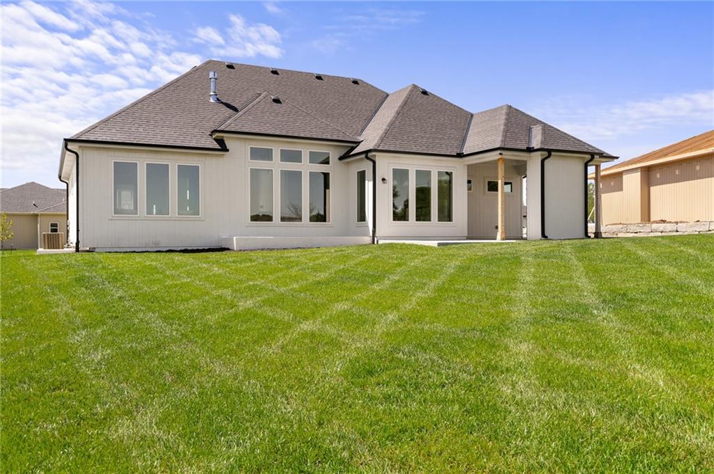 JFE Construction presents its stunning Gunnison Transitional Rev. 1.5-story plan in the highly desirable Prairie Canyon community. A dramatic, all-window A-frame entry welcomes you into the open-concept living, kitchen, and dining area. Light, wide-plank flooring, custom built-ins with floating shelves surrounding the stone fireplace, and designer lighting create a warm and sophisticated transitional style throughout the home. The beautifully appointed kitchen features a large island with a gooseneck faucet, stainless steel appliances, custom painted cabinetry, and a butler’s pantry with coffee bar. The adjacent dining area provides the perfect setting for everyday meals or entertaining guests. Extend your gatherings outdoors on the covered patio, complete with a cozy gas fireplace. The spacious primary suite offers a relaxing retreat, featuring elegant tile flooring in the ensuite bath, a soaking tub, walk-in shower, and double-bowl vanity. The expansive walk-in closet includes convenient third-tier storage for off-season items. The main level also includes a second bedroom or office, along with a generously sized mudroom and laundry room conveniently located off the garage. The staircase to the lower level is enhanced with designer stair carpet beautiful sconces. Downstairs, you’ll find a large recreation area ideal for relaxing or entertaining, featuring durable LVP flooring and a full bar with microwave. Two additional bedrooms and a full bathroom complete the lower level. This home also offers abundant storage throughout. Prairie Canyon offers maintenance-provided living with lawn care and snow removal included, and fencing is permitted within the community. Experience the beauty and comfort of this exceptional home—Prairie Canyon truly has so much to offer.