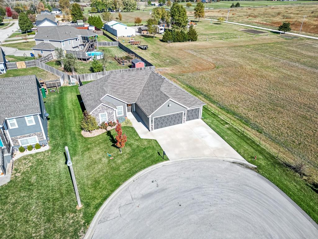 3-BEDROOM RANCH WITH OPEN FLOOR PLAN AND COUNTRY VIEWS — Looking for single-level living with style and comfort? This beautiful true ranch home has no steps and features an open layout perfect for easy living and entertaining. The living room boasts vaulted ceilings, a cozy fireplace, and luxury vinyl flooring that flows through the main living areas. The spacious kitchen is designed for everyday function with granite countertops, an island, and a walk-in pantry. The primary suite offers a private retreat with a large walk-in closet that connects directly to the laundry room, plus a luxurious bath with double vanities, granite counters, and a walk-in shower. Enjoy morning coffee or quiet evenings in the enclosed patio area, or take in the peaceful country views from the quiet cul-de-sac setting. With open space beside the home and a great location close to town, this property blends modern comfort with serene surroundings—perfect for anyone wanting a move-in-ready ranch in a quiet community.