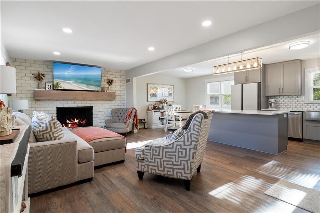 Meticulously maintained 4-bedroom, 2 bath, nestled near the heart of Parkville. This clean, move-in-ready home features nearly 1842 square feet of living space. Open- concept living room with cozy fireplace flows into the stunning eat-in kitchen with new cabinetry, oversized center island with built in microwave, new stainless-steel appliances, and tile backsplash. Primary bedroom includes private en-suite with tiled shower. Two additional bedrooms share a second full bath. Walk-out lower level offers a fourth bedroom AND a bonus rec room for entertaining. Detached outdoor deck perfect for grilling and relaxing. Rear-entry 2-car garage with abundant driveway parking. Neighborhood Park with-in walking distance. Easy access to top-rated schools, shopping and dining, you will enjoy the best of suburban living with the vibrant KC lifestyle just a stone's throw away.