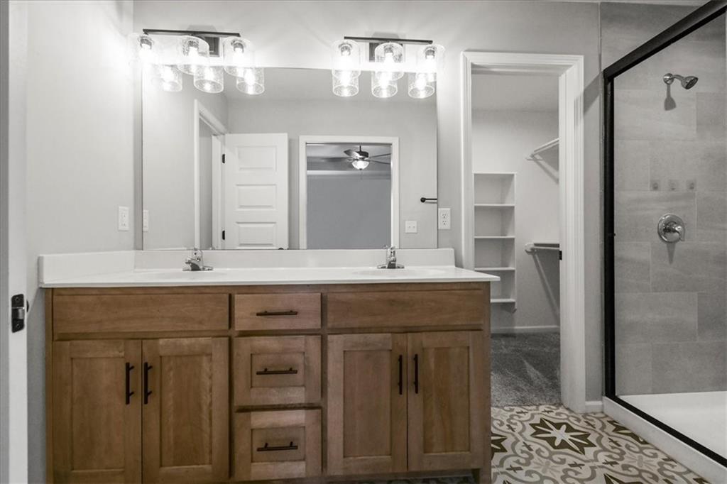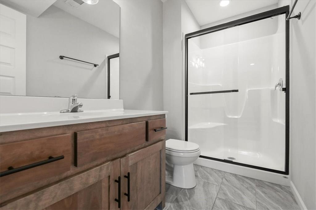 Prepare to fall in love with this almost-new construction, split-level home in the desirable North Creek community of Oak Grove! Designed with an inviting and calm aesthetic, this property perfectly blends modern features with cozy, livable spaces. It's ready for you to move in and start making memories! The architectural style creates a wonderful separation between living areas while maintaining an open, airy feel thanks to the vaulted ceilings and open-concept layout between the kitchen and living room. The gourmet kitchen is truly the heart of the home, featuring sparkling white cabinetry, a large center island with a crisp white quartz-style countertop, a full suite of stainless steel appliances, and a chic subway tile backsplash. The main living area is highlighted by a stunning, vaulted ceiling and a beautiful fireplace framed by white subway tile and a rustic wood mantle—perfect for gathering on chilly evenings. Your private primary suite is a luxurious retreat, featuring a tray ceiling and soft, neutral-toned carpet. The ensuite bathroom is a showstopper with a double-sink wood-toned vanity, contemporary light fixtures, and eye-catching patterned tile flooring. The attached walk-in closet offers smart organization with built-in shelving and ample hanging space. You'll appreciate the continuous, premium hard-surface flooring throughout the main floor living areas for easy maintenance and a cohesive look, complemented by sleek black hardware on cabinets and doors for a bold, contemporary contrast. The staircase, featuring modern black wrought iron balusters, connects the levels with style. The finished lower level provides excellent bonus space for a second family room, home office, or play area, complete with large windows for natural light. The exterior offers great curb appeal with charming gray-blue siding, white trim, a stone-accented front, and a two-car garage. This home is truly a special find—a perfect blend of style, comfort, and functionality.