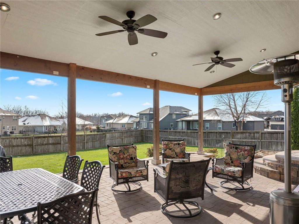 Welcome to this beautiful 2-story home in the highly desirable Falcon Lakes community—where comfort, convenience, and resort-style amenities come together in a stunning setting. Located in the award-winning Basehor school district, this 4-bed, 2.5-bath home features brand-new carpet, a newer roof, gleaming hardwood floors, and an open, inviting layout perfect for everyday living and entertaining. The spacious kitchen offers an island, pantry, and casual dining area, and flows seamlessly into the living room with a cozy gas fireplace. A formal dining room adds extra space for hosting holidays and special gatherings. Step outside to your expanded custom covered patio—truly an entertainer’s dream—complete with a granite counter, and cabinet storage for outdoor cooking, two outdoor ceiling fans, and ample outlets ready for TVs or lighting. The fenced backyard provides privacy and the home includes a sprinkler system to keep your lawn looking its best. Upstairs, relax in the spacious primary bedroom featuring a vaulted ceiling, walk-in closet, and a bath with dual vanity, a separate shower, and a spa tub. Three additional bedrooms—each with walk-in closets—plus a dual-vanity hall bath and a convenient laundry room complete the second level. The oversized 3-car garage offers overhead metal storage racks, and the unfinished daylight basement is already stubbed for a bath, giving you endless opportunities to expand. Living in Falcon Lakes means enjoying top-tier amenities: a sparkling outdoor pool, playground, tennis courts with pickleball markings, basketball court, and access to the incredible Falcon Lakes Golf Club. The community clubhouse is home to The Nest restaurant, where you can dine with picturesque lake views. Golfing, the driving range, and putting greens are just moments away. With easy access to Fort Leavenworth, Kansas City, and The Legends for shopping, dining, and entertainment, this home truly has it all. Sqft per county; Room sizes rounded