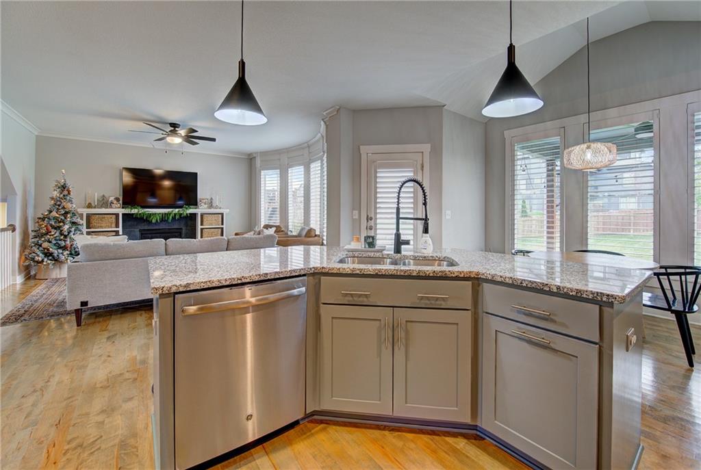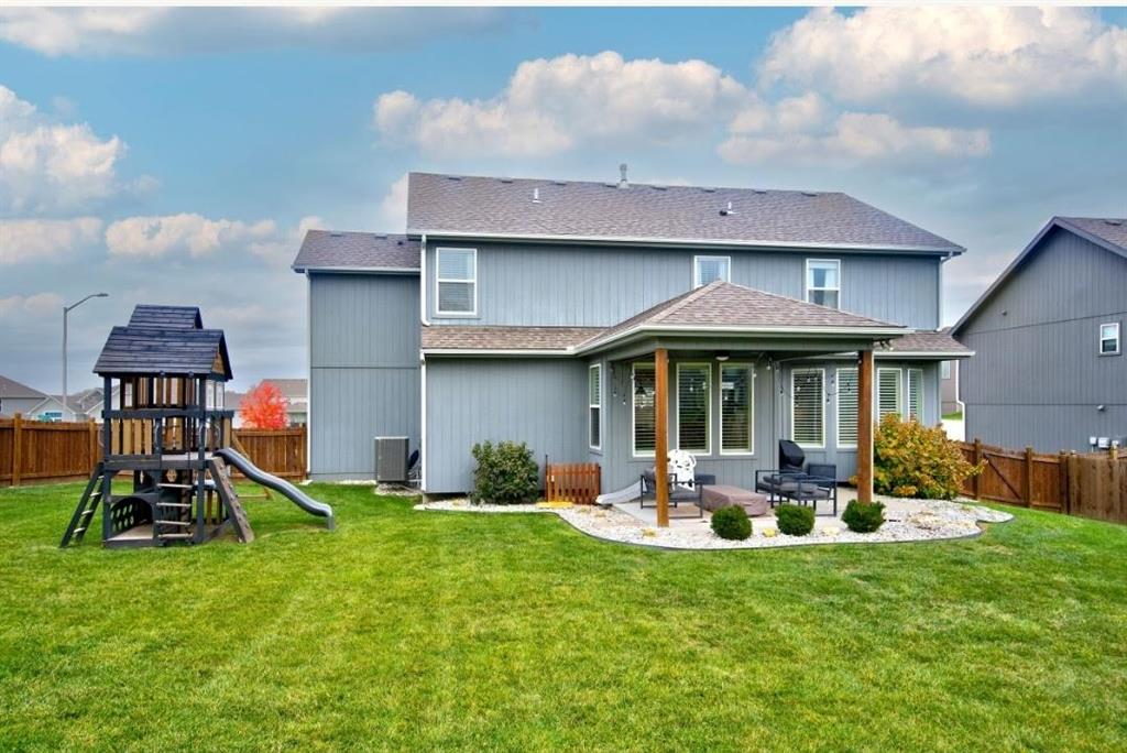 This two-story home, built in 2018, shows the pride of ownership. It looks like new without the wait! Entering you see the hardwood floors and vaulted ceilings, open floor plan and its almost 3,500'. The main level features a formal dining area into the living room, with a beautiful fireplace, large windows for the sun to shine through. And nice built-in shelving. The eat-in kitchen has beautifully painted cabinetry, an island with extra seating, and a large walk-in pantry with a nice 1/2 bath on the main level. From the kitchen, you can access the covered patio, an ideal space for entertaining and watching the kids and pets play in the fenced back yard. Situated on a 0.26-acre lot, the backyard offers nice landscaping, a privacy fence, and nice plants and bushes. Upstairs, the primary suite awaits, complete with a tray-lit ceiling and large windows. The oversized primary bathroom features beautifully tiled floors and shower, a large soaker tub, and a spacious walk-in closet. Also includes two additional bedrooms with a Jack and Jill bath, a 4th bedroom with private suite, and a nice laundry room on this level. The lower level, finished in 2020, incorporates the modern finishes and attention to detail found throughout the rest of the home. It features a tiled wet bar with extra cabinetry, a sink, and quartz counters, and an extra count top perfect for the kids to do homework or just a place to enjoy. A cozy family room and 2nd fireplace. The fifth bedroom/office, with double door entry, and the fourth full bath complete this level, with luxury vinyl plank floors throughout With access to the wonderful amenities Benson Place Fieldstone has to offer and located within the award-winning Liberty School District. This home truly has it all. Come See, Fall in Love and make this your next place to call Home.