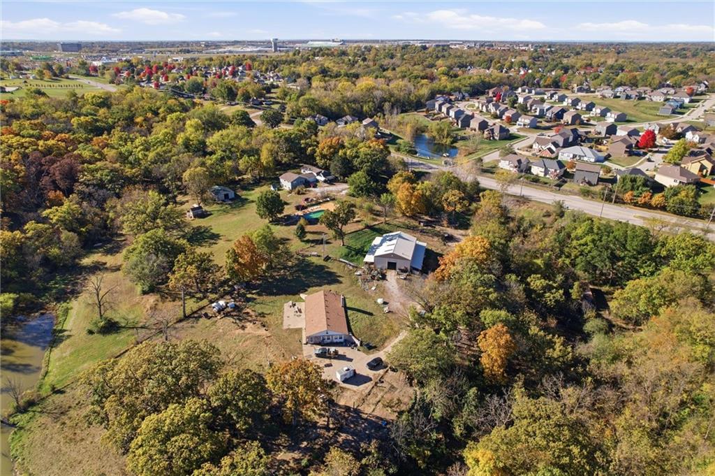 LOCATION LOCATION LOCATION! Discover an incredible opportunity on 11.64 acres in the heart of the legends. This 1-bed, 2-bath ranch offers an open floor plan with a cozy fireplace and a large bonus room, providing plenty of space to add additional bedrooms or customize to your needs. Home offers great potential and is ready for your vision and updates or ready for you to build your dream home! Enjoy wooded acreage with a beautiful large pond and peaceful, scenic views at the back of the property. Partially fenced with room to explore, create walking trails, or simply enjoy nature. A spacious outbuilding offers great storage or workshop possibilities. No flood insurance required All of this just minutes from shopping, restaurants, highway access, and less than a mile from the legends and Amazon—plus located in the highly sought-after Piper School District. A rare chance to create your dream home, enjoy acreage, and even have animals, all while staying close to city conveniences.