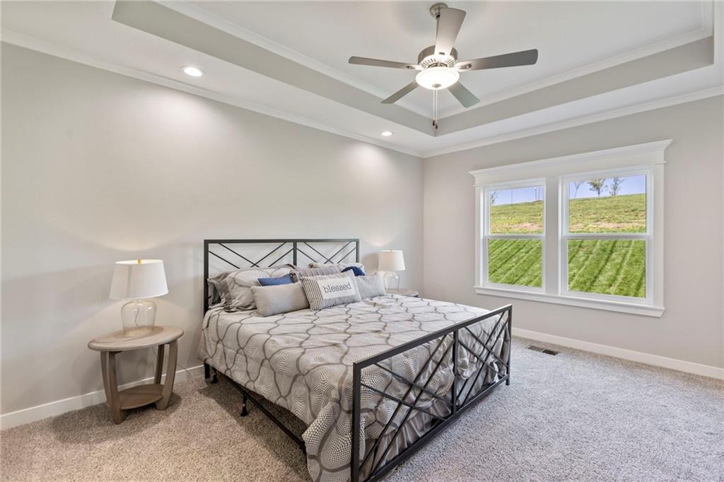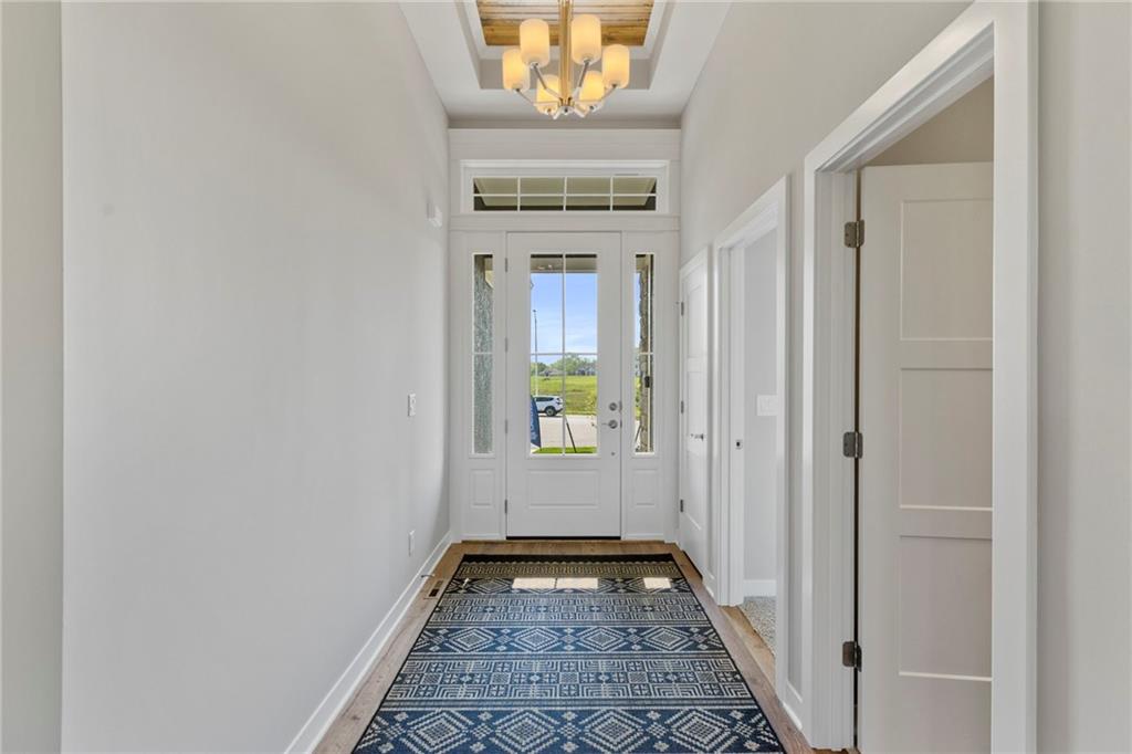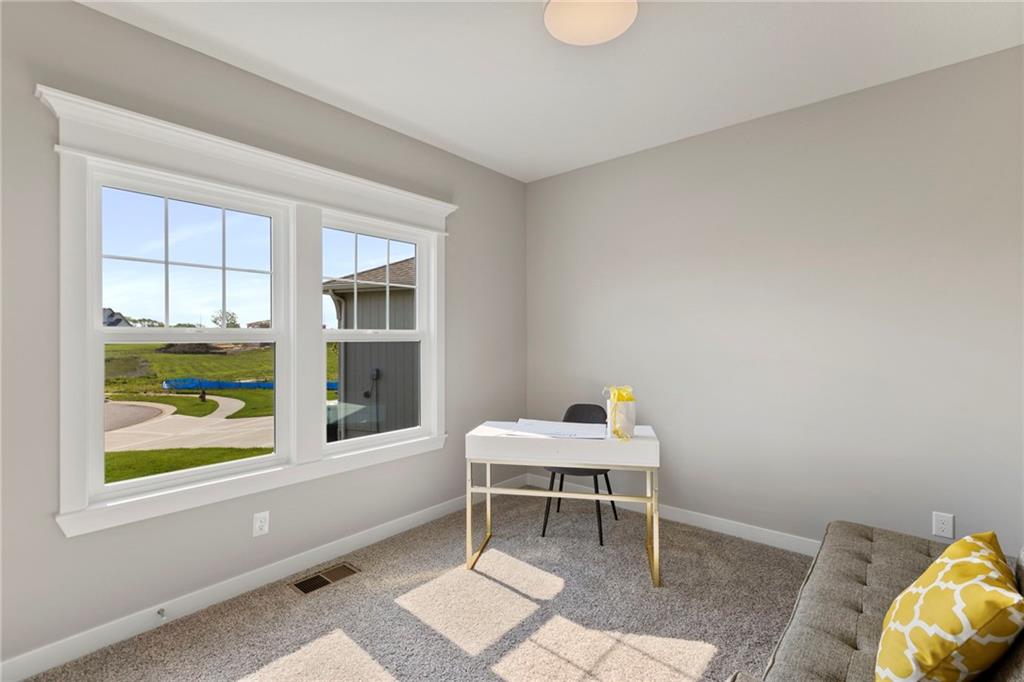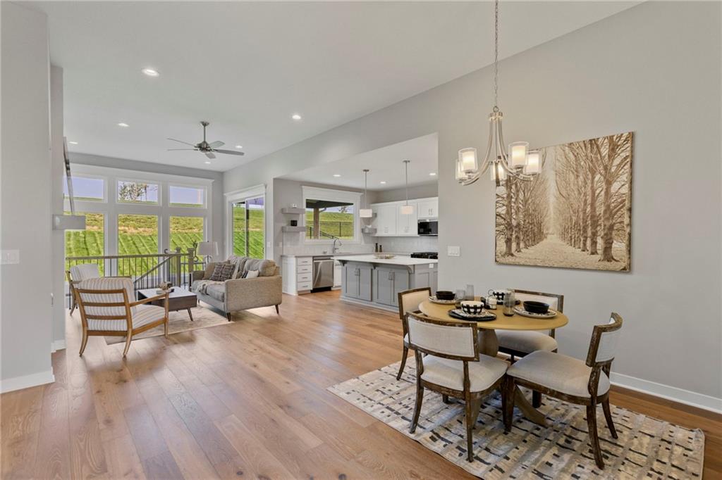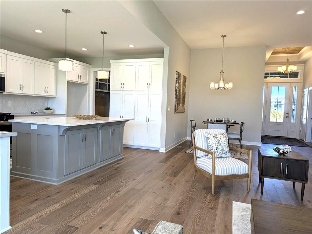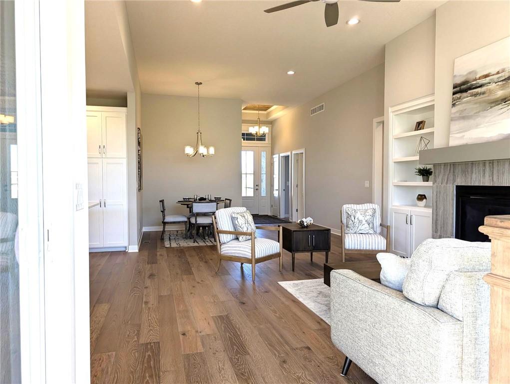 ** Exceptional quality meets effortless living in the final Patriot Home available in Maintenance Provided Cadence Villas.This home is finished.** Resize your living space with ease and enjoy the benefits of maintenance provided living in the Truman by Patriot Homes! Located on a secluded cul-de-sac homesite, this Reverse 1.5-story open concept floor plan includes a stone-clad traditional façade, three-car garage, and covered front porch. The 8-foot front door leads into a spacious entry with a 12-foot ceiling highlighted by an elegant trim treatment and chandelier. Hardwood flooring throughout the main entry, living and kitchen accentuates the seamless flow between the dining room, kitchen, and great room while a bedroom and full bathroom just off the entry makes for an ideal guest or bonus room. Arguably the showpiece of the home, the kitchen is outfitted with expansive quartz countertops, large center island, shaker style custom cabinetry, and stainless steel Samsung appliances. Opposite the kitchen is a cozy great room with a gas fireplace, built-in bookshelves, floor-to-ceiling windows, and an 8-foot sliding glass door that opens to a covered patio. A private hallway leads to the master suite showcasing an exquisite freestanding soaker tub, zero entry walk-in shower, Bluetooth audio system, and a sizeable walk-in closet with third tier pull down rods. The Truman comes equipped with additional conveniences such as 8-foot tall garage doors with an included belt drive opener on main door, an irrigation system, high efficiency 96% Lennox furnace, whole house humidifier, and 50-gallon electric water heater. Homeowners also have an annual HOA fee of $600. This villa is in Prestigious Phase 1, Cadence Villas, a Hunt Midwest Maintenance Provided Community.