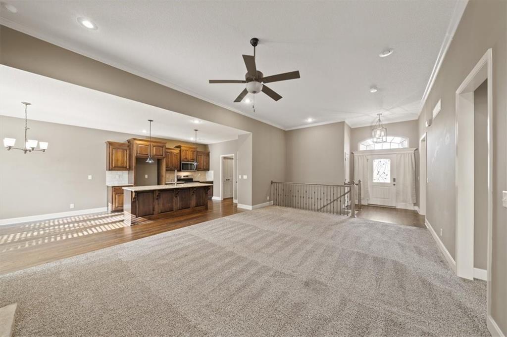 Welcome home to 105 N Eastglen! Reverse 1.5 Story located in a quiet cul-de-sac of the coveted Eagle Glen Subdivision. Open concept on main level with lofty ceilings and lots of natural light. Kitchen features large island, walk-in pantry, and stainless steel appliances. Main level primary with private full bathroom and walk-in closet. Walk-out basement with large rec area, two bedrooms, and full bathroom. AMAZING covered deck for entertaining. Spacious three car garage with large driveway. Close to highways and shopping. Raymore school district.