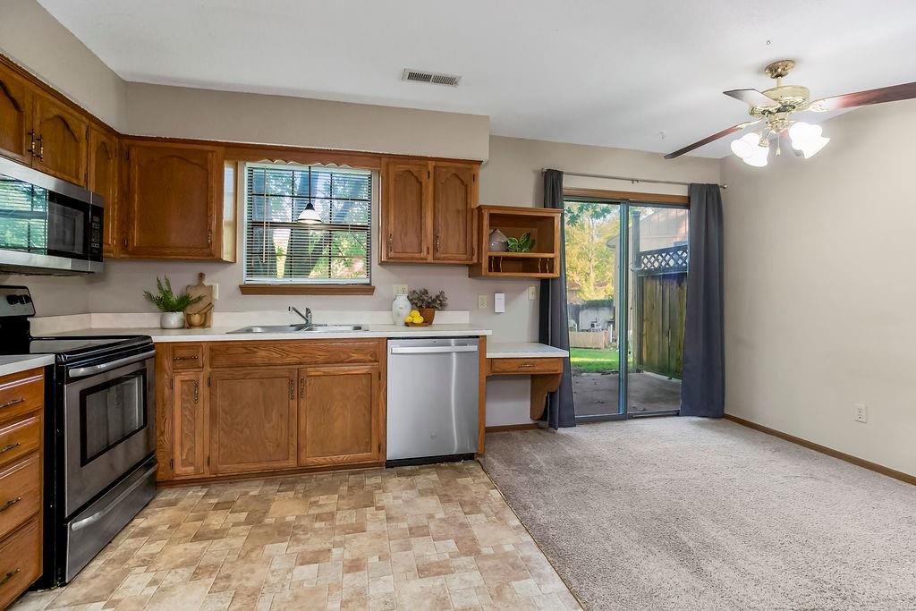 Don’t miss your opportunity to own this beautiful townhouse in the heart of Lee’s Summit! Step inside to a welcoming living room with a cozy corner fireplace—perfect for relaxing evenings. The kitchen shines with sleek stainless steel appliances, generous cabinetry, and a bright breakfast nook that opens to the back patio. A convenient half bath completes the main level. Upstairs, you’ll find a spacious primary bedroom with vaulted ceilings and private access to the full hall bath, which offers a large vanity, linen closet, and shower/tub combo. Both bedrooms include ceiling fans, large closets, and window blinds for added comfort. Enjoy your own one-car garage and extended driveway, too! The HOA covers lawn care, trash, and exterior maintenance (studs out), while owners insure the interior. The roof is just five years old! All of this in a prime location—minutes from vibrant downtown Lee’s Summit with shopping, dining, and entertainment, plus quick highway access for commuters. Schedule your showing today!
