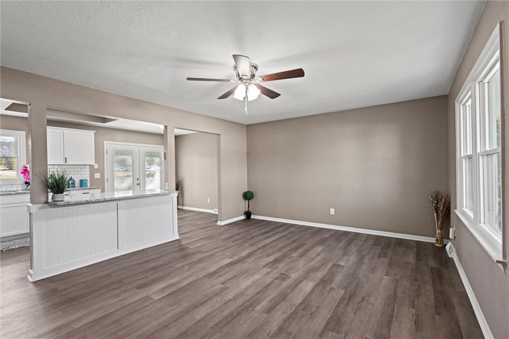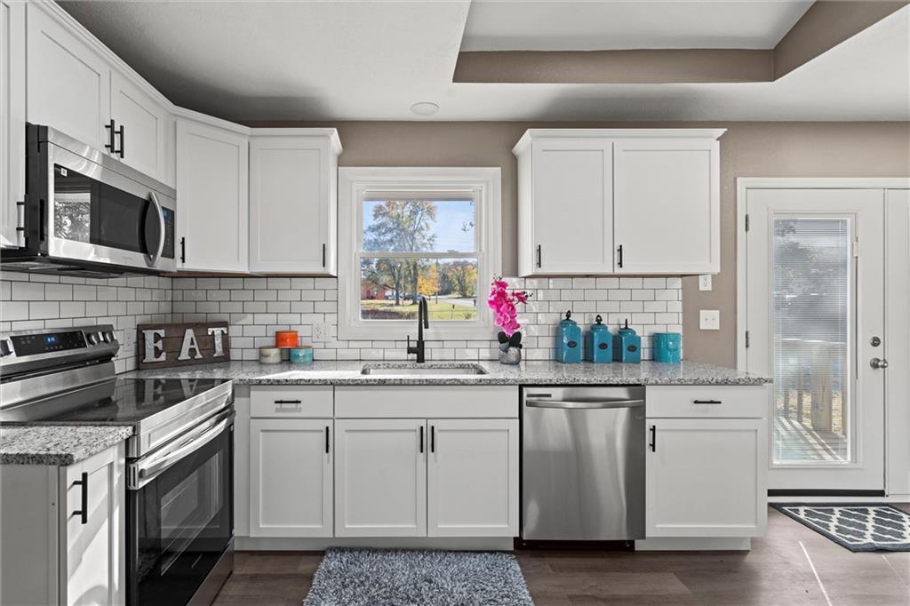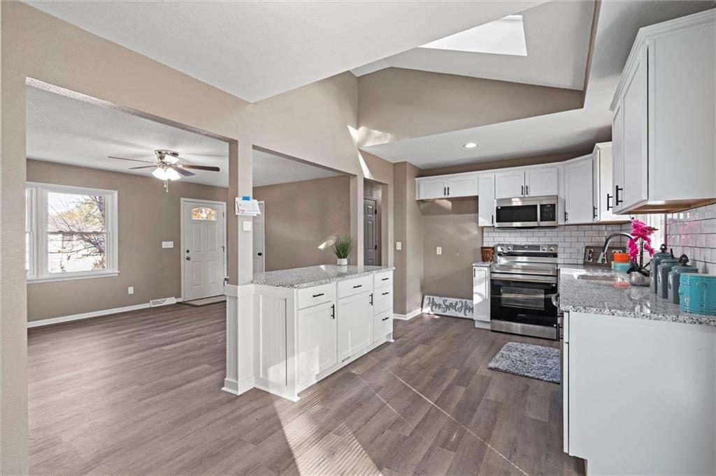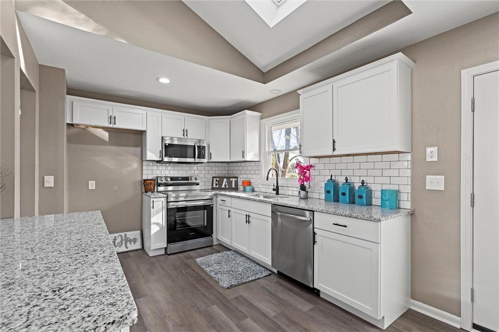 Step inside this beautifully updated home featuring a spacious living room and a rare open-concept kitchen — perfect for entertaining! The kitchen showcases brand-new shaker cabinetry, granite countertops, a subway-tile backsplash, stainless steel appliances, and ample counter space for cooking and gatherings. You’ll find three comfortable bedrooms and a fully remodeled bathroom with an updated vanity, a tiled tub/shower combo, and a skylight that fills the space with natural light. Head downstairs to a versatile media or lounging area and a second fully remodeled bathroom, ideal for guests or family movie nights. Step outside to a massive deck overlooking an even larger fenced backyard — perfect for kids, pets, or entertaining outdoors. With maintenance-free vinyl siding and energy-efficient vinyl windows (2017), roof only 11 years old, there’s truly nothing left to do but move right in!