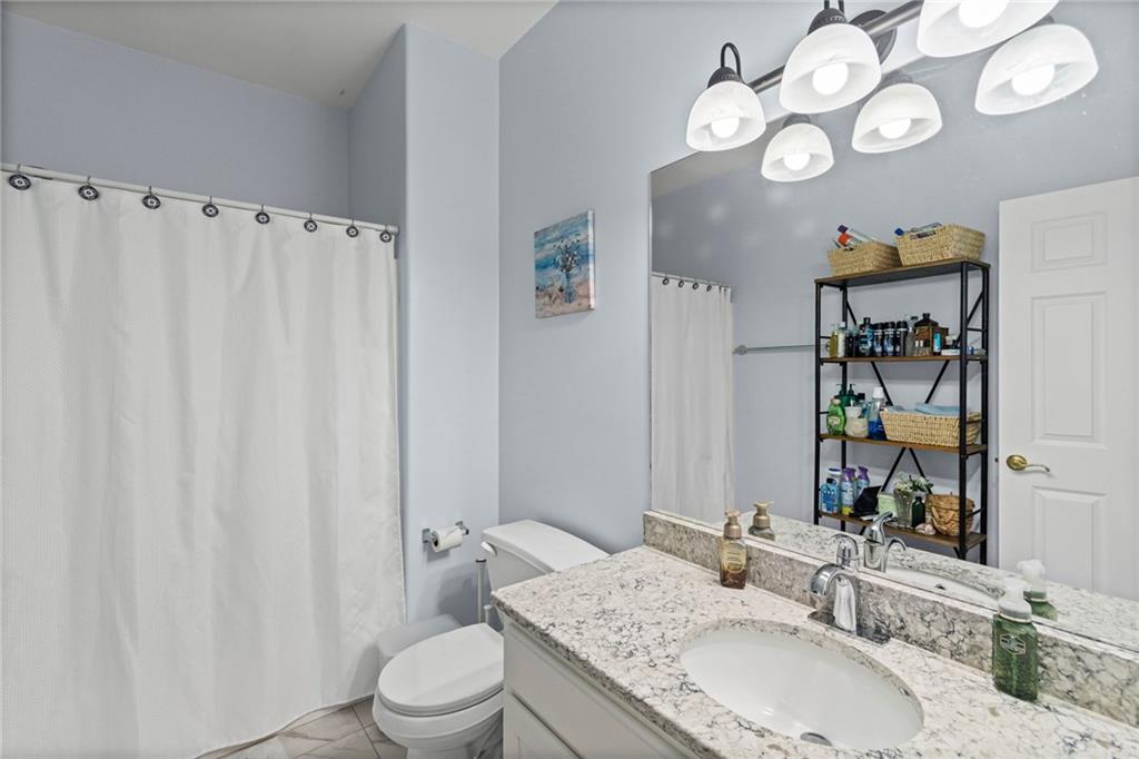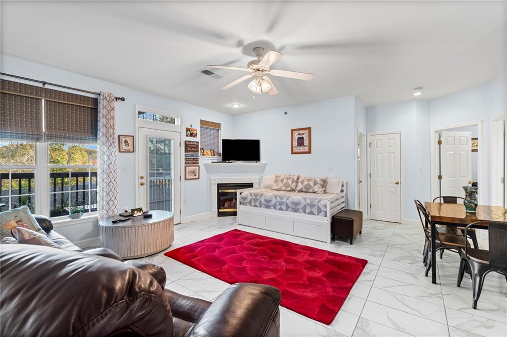 Welcome to this beautifully remodeled 2-bedroom, 1-bath condo in the highly desirable Stonegate community, where modern finishes meet low-maintenance living in a prime location. The open-concept layout features soaring ceilings, abundant natural light, elegant tile flooring, an inviting gas fireplace, and a stylish kitchen with quartz countertops. The spacious living area extends to a private deck—perfect for morning coffee, evening unwinding, or entertaining guests. Enjoy the ease of everyday living with in-unit washer and dryer hookups and the added benefit of a detached garage, offering both convenient parking and flexible storage. Reliable year-round climate control comes courtesy of a newer furnace (2023) and A/C unit (2019). Experience the ease of low-maintenance living in a serene, beautifully maintained community with effortless access to highways, parks, shopping, and dining. Discover the charm of Stonegate living—your next chapter begins here.