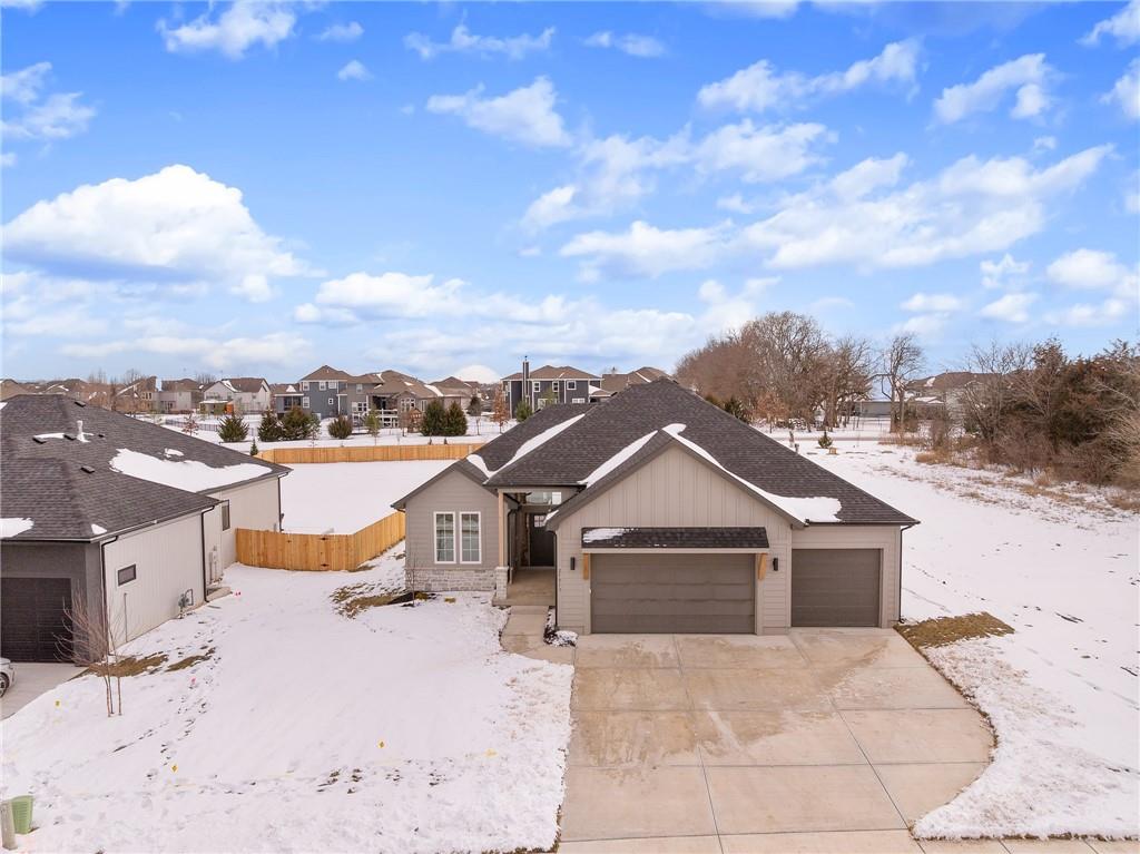 Come explore the award-winning Shea II Ranch by DCB Homes! This 4-bedroom, 3-bath beauty features a striking new front porch elevation and an inviting open layout designed for modern living. The main level impresses with a vaulted ceiling spanning the Great Room and Kitchen, creating a bright, airy feel. The kitchen offers abundant cabinetry, a large island, built-in appliances with a gas range, and a walk-in pantry. A spacious dining area is a buyer favorite that opens to the back deck—perfect for entertaining. The primary suite features a walk-in shower, freestanding tub, double vanities, and a generous walk-in closet. Two additional bedrooms and a full hall bath are conveniently located on the opposite side of the main level, along with a laundry attached to the Primary and mudroom. The finished Lower Level includes a large rec room with bar, fourth bedroom, third full bath, and two large storage areas. A 3-car garage completes this fantastic plan. **This home is at foundation phase. Photos are of a similar home. Taxes are estimated.** Lakeview Ridge is a new build community just west of Lake Olathe with great homes started and fantastic lots available. POOL coming in 2027. You can get to the neighborhood off of Dennis & Houston with easy access from K7 or coming from Lakeshore. Our Sales Office is located 14271 Houston. Our development is right next to Lake Olathe and neighborhood feeds into Clearwater Creek Elementary, Oregon Trail Middle School and Olathe West High School.