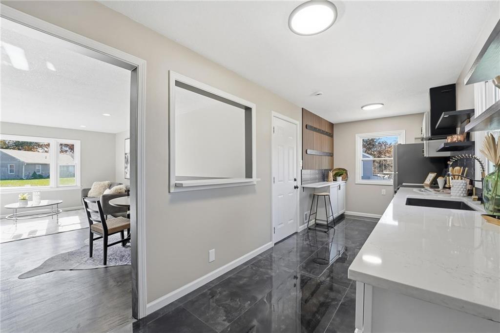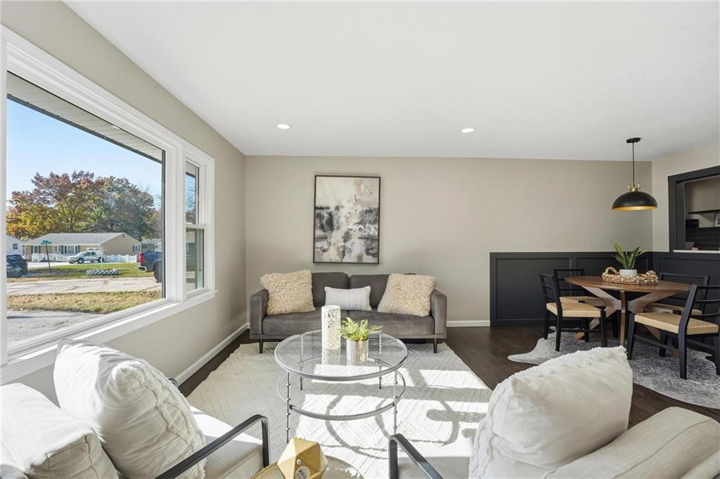Beautifully Renovated Ranch in the Heart of the Northland! This fully updated 3-bedroom, 2-bathroom ranch-style home offering modern finishes, timeless design, and unbeatable convenience in Kansas City’s Northland. Recent exterior improvements include new siding, new windows, and a new roof, providing long-term peace of mind and excellent curb appeal. Inside, a bright and inviting living space features refinished hardwood floors, fresh neutral paint, and updated trim and hardware for a clean, cohesive feel. The stunning designer kitchen serves as the centerpiece of the home, showcasing sleek black tile accents with gold detailing, quartz countertops, open shelving, new stainless steel appliances, and upgraded cabinets and hardware. The dining area sits just off the kitchen for easy everyday living and entertaining. Both bathrooms have been fully remodeled, featuring modern tilework, stylish lighting, and high-quality fixtures. All three bedrooms offer comfortable space with updated finishes throughout. The expansive unfinished basement is freshly painted and ready for storage, a workshop, or future expansion. A one-car garage and large driveway provide convenient off-street parking. Outside, the freshly painted concrete patio offers a perfect spot for outdoor dining and relaxation. Located minutes from dining, shopping, schools, and major highways, this home blends style, comfort, and location into one incredible opportunity. Don’t miss your chance to own this beautifully updated Northland ranch!