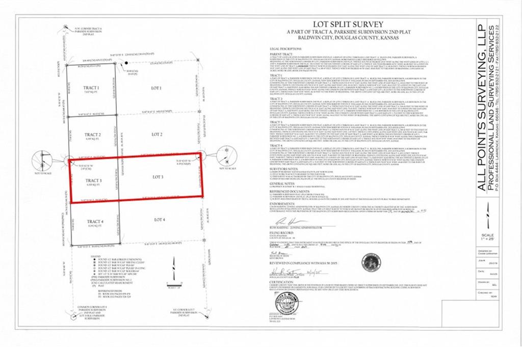 Build your dream home! Beautiful subdivision lot within a small subdivision of 5 homes within the Baldwin City limits. Lot has a gradual slope from the front of the lot back toward the creek making it perfect for a possible walkout foundation. The area where you'd build a home is cleared and kept mowed. The rear of the lot has a creek and heavy tree/brush line. Lot 3 was just increased to include tract 3 making the lot extra deep extending past the creek at the rear. Where the creek is located is probably in a flood plain but where you would build a house up closer to the street is not (please verify). There are orange survey flags marking either side of the property and neighboring homes on either side. There is a driveway/street easement at the front of the lot for the neighbors to access their properties. Homes Association hasn't been active for the past 3-4 years but hasn't been dissolved. Taxes are estimated. Lot size is estimated. HOA fees are estimated (if HOA becomes active again). Verify utility availability.