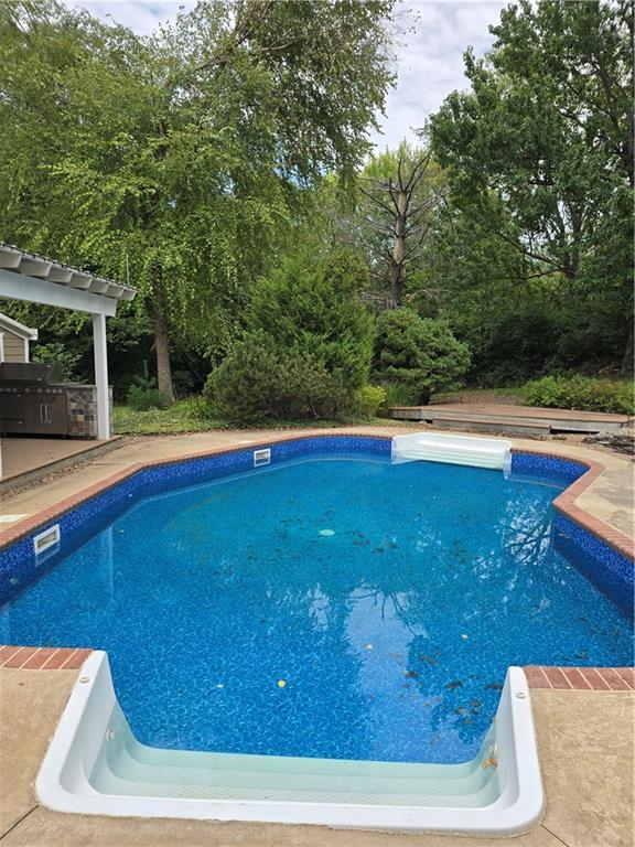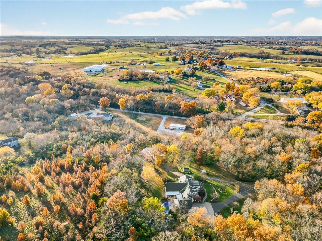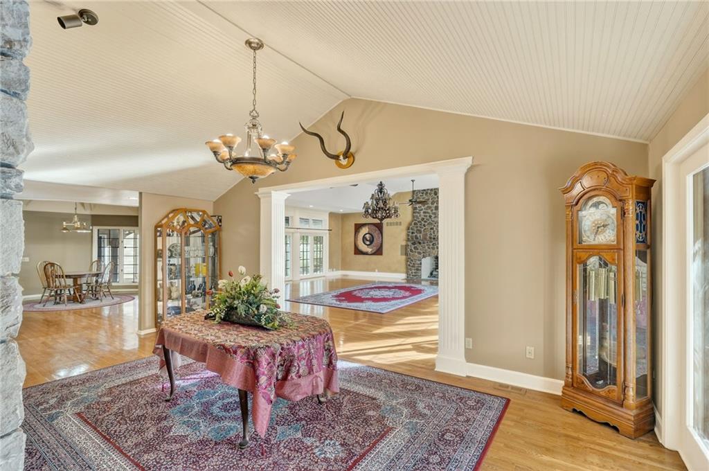 Secluded on a quiet road 10 miles from Liberty is 8 acres of mature wooded timber & tranquility. The homesite includes a true ranch, 7 car garage w/ inground pool, incredible 65x37 outbuilding w/ finished space ideal for an office/huge workout area and kitchen and bath. Driving through the front gates down the newly blacktopped, paved drive over the bridge that suspends a creek you happen on a humble ranch. New roofs on house and outbuilding along with new lightning rods provide the buyer with $80k + of upgraded components. The exterior has fantastic grounds filled with nature and solitude. At the main house, you are met with a floor to ceiling stone masonry fireplace w/ an oversized box. Oak wood floors throughout to 2 bedrooms & a bath on the south side and a 1000 sqft living area the size of a ballroom creates a sunny, one of a kind recreation room on the main level. This space provides family connection/togetherness on the main level. The master is oversized and has a bath with tile flooring and shower along with a large tub. The kitchen has granite countertops, stainless appliances including industrial Viking appliances along with a pantry. Downstairs is a perfect place for an apartment having a full kitchen, dining area and non conforming bedroom. It has 2 additional rooms that can be used as offices, bedrooms, hobby rooms, plus a 4th bedroom, etc. The true kicker is the $100K solar panels and battery backup, provide FREE electricity to the main house every month of the year. The outbuilding has an area for a kitchen and bath which enables this space to be the perfect place to have someone close, but not too close. A great shop for whatever your mind can imagine along with a finished space for an apartment, business, or workout area provides endless opportunities. Outdoor pool and outside kitchen provide automatic fun in the warm season.