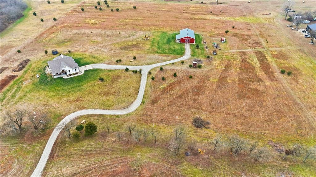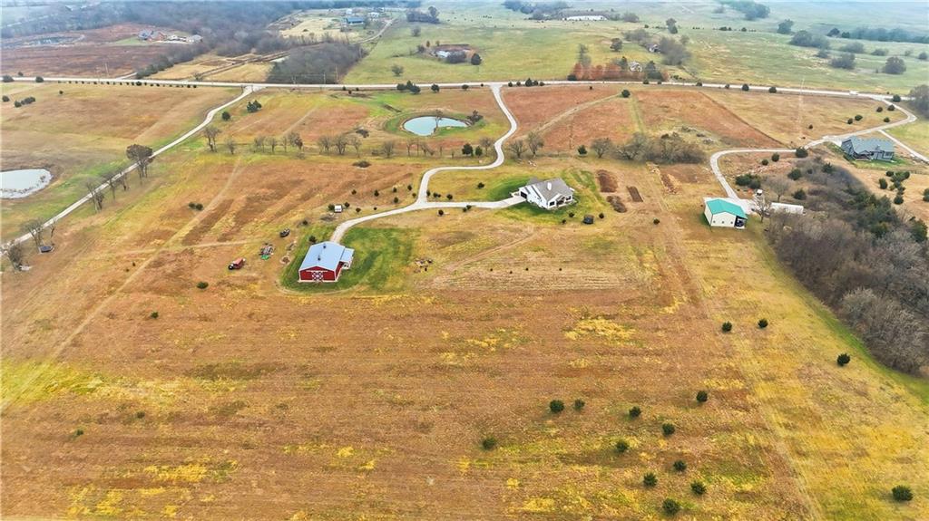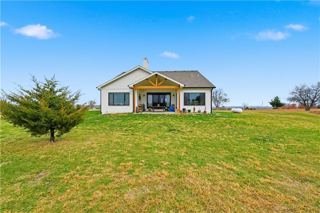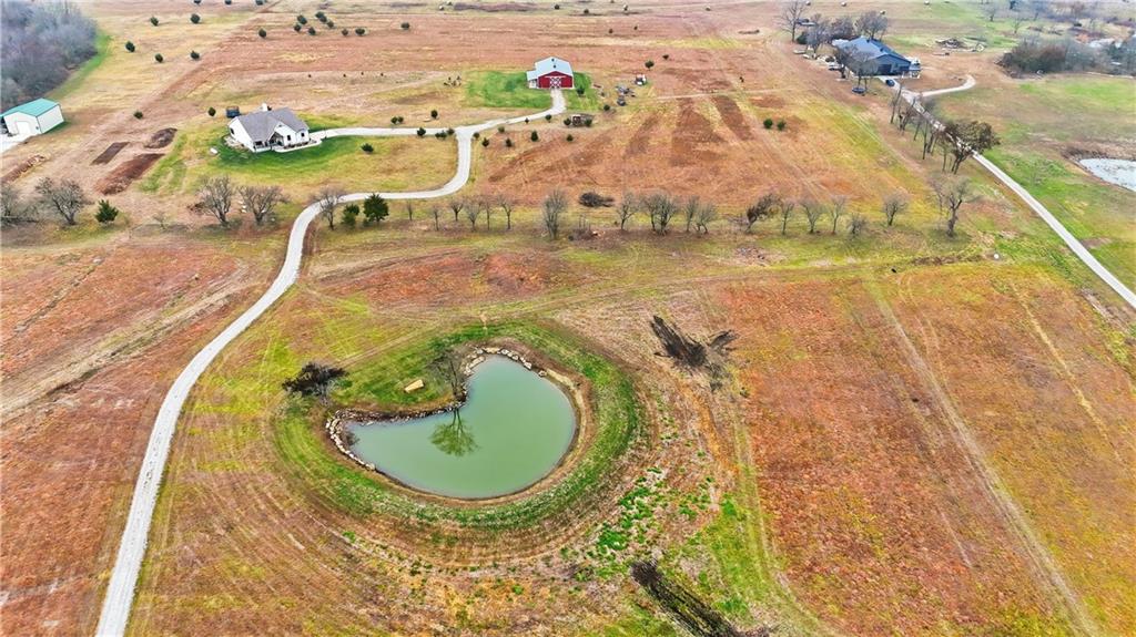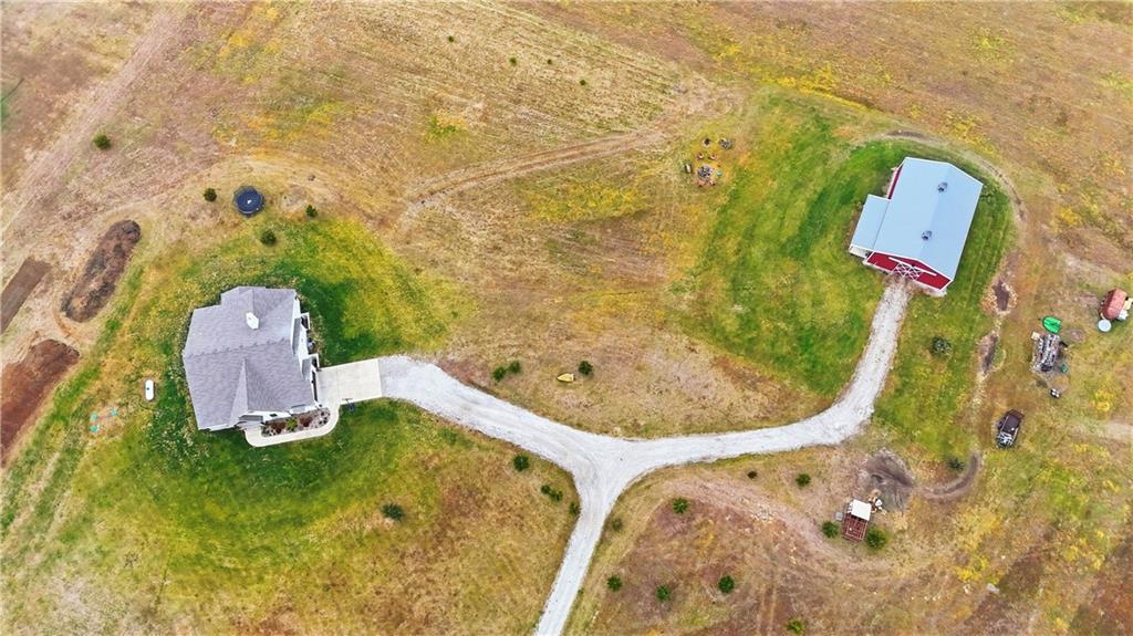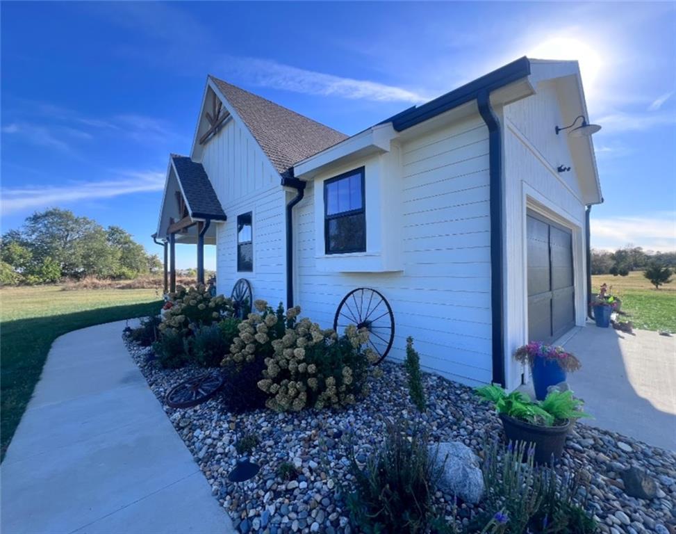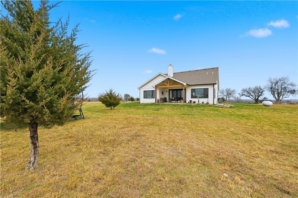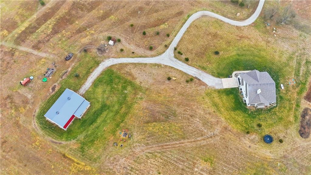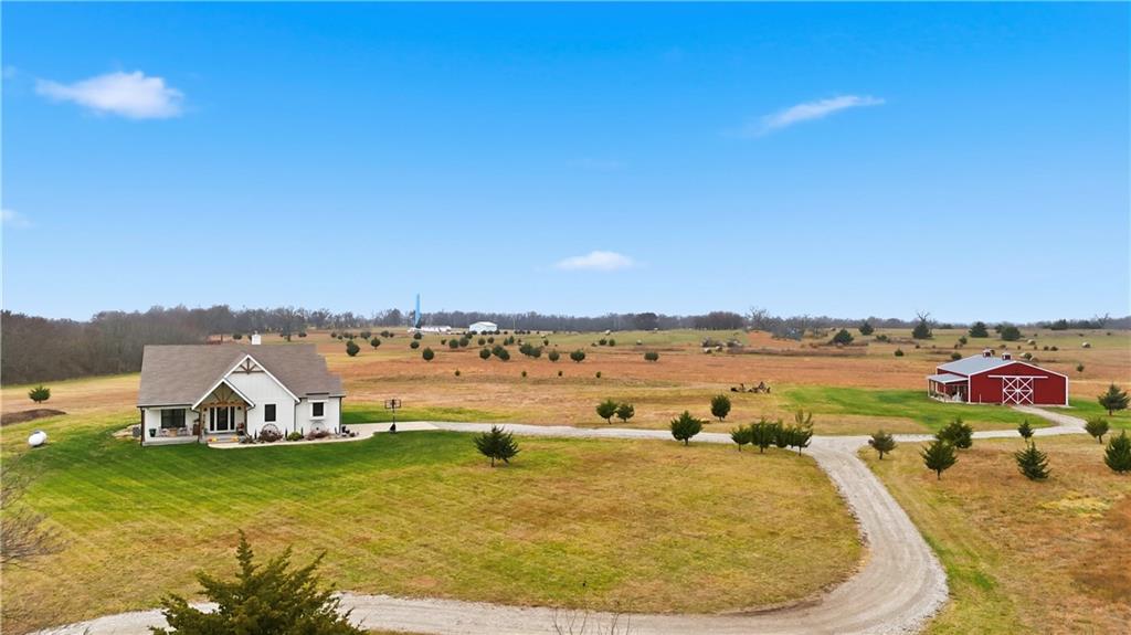 Your Dream Home Awaits! This gorgeously appointed 4 Bedroom 3 and 1/2 Bathroom Reverse Story 1.5 is better than NEW! Your Future Home offers an open concept main level with a grand foyer, second bedroom/office, Chefs Delight Kitchen, Dining Space, Great room, Primary suite, Laundry room, mud room and oversized garage. The Charming kitchen offers a HUGE walk-in Pantry, 6ft island with Quartz countertop, loads of storage, 36" Gas stove, and Painted Custom cabinetry. Your Great room offers a wood burning fireplace and double sliding doors that open to the covered porch to take in your country views. Enjoy retreating to your spacious primary suite where you can relax in your walk-in shower with custom tile. Your magnificent walk-in closet connects conveniently to the laundry room. Head down stairs to your sizable recreational room that connects your exercise room, bonus room, and 2 additional bedrooms joined by a Jack & Jill bathroom. Need storage? You've found it. The amount of storage this home offers is substantial. Enjoy the space your acreage offers for you to enjoy. Fish in your 1/3 acre pond, store your toys in the 40x60 shop/outbuilding with concrete & electricity or turn it into a barn for horses or other animals, start a large garden, your options are almost endless. Easy highway access. Only 14 minutes from Louisburg for shopping and restaurants, 8 minutes from Linn Valley Lakes, and 21 minutes La Cygnes Lake. Tour this home today before you miss out! Professional photos taken tomorrow.