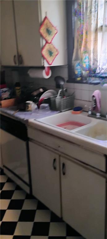 Kitchen with light countertops, dark flooring, dishwasher, and white cabinetry