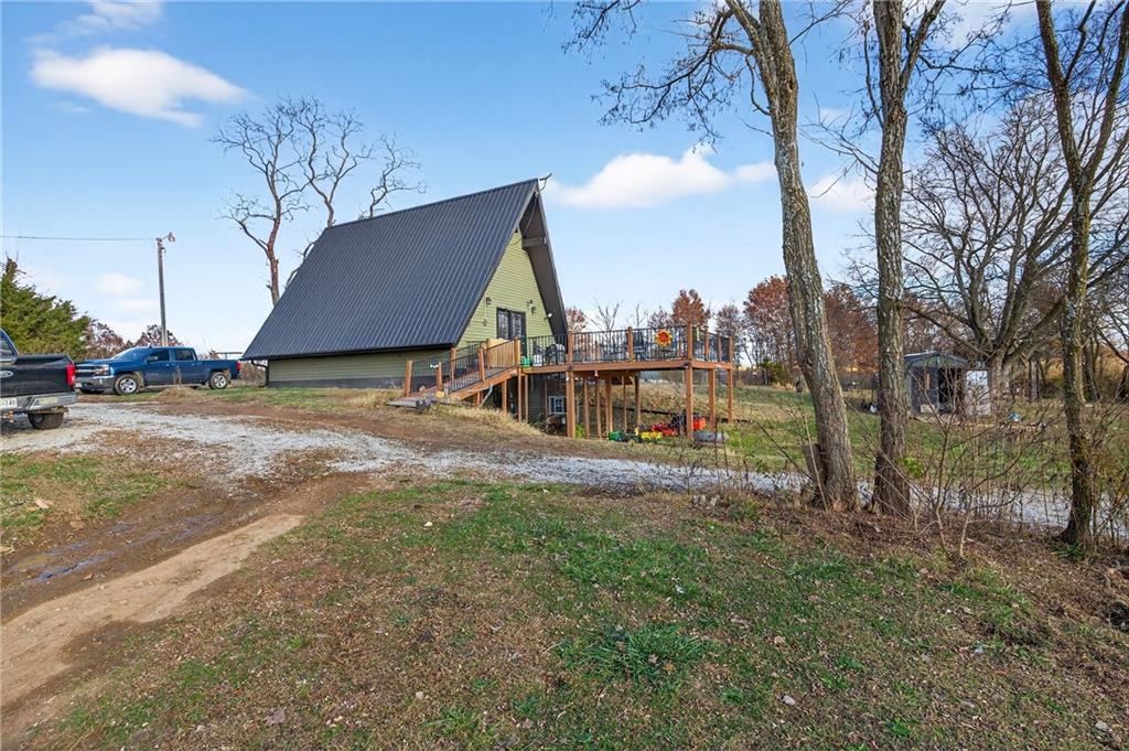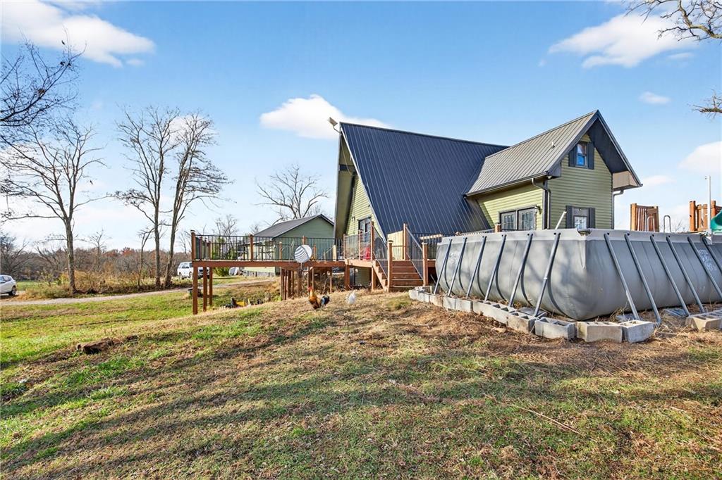 Experience A-frame charm combined with modern improvements across this 1.9-acre property that includes a full guest house and inviting outdoor amenities. A great setup for multi-generational living or extra space. Located in a convenient rural corridor between Nevada, Missouri and Fort Scott, Kansas. The primary A-frame style home, built in 1992, offers 1,484 sq. ft. with a warm and inviting loft layout. As you enter, you’re greeted by a striking vaulted wood ceiling and an open living space filled with natural light. The kitchen sits just off the living room and includes updated appliances, making daily living and entertaining a breeze. This home offers 2 bedrooms, 1 non-conforming bedroom, and 2.5 bathrooms. The main-level primary suite provides comfort and privacy, while the finished walkout basement adds versatility for additional living space, guests, or hobbies. Step outside and enjoy a large deck overlooking the above-ground pool, plus a charming firepit area complete with swinging benches — a perfect setting for quiet evenings or gathering with friends and family. The acreage features peach trees, pear trees, grape vines, and blackberry bushes, adding to the peaceful rural appeal.An added bonus is the 840 sq. ft. guest house, offering 2 bedrooms, 1 non-conforming bedroom, and 1 bathroom — ideal for guests, extended family, or potential rental income. Major improvements in recent years include: Central heat & air, Newer metal roofs on both homes and all outbuildings, Newer siding on both homes,Newer windows and doors, Newer flooring, Newer well water filtration system. And if it sweetens the deal…the owners are even willing to leave the chickens — cluck, cluck! Important Note: The sellers lead a very busy lifestyle. To help buyers envision the layout and potential, some rooms have been virtually staged. The virtual staging is simply provided for convenience and visualization.
