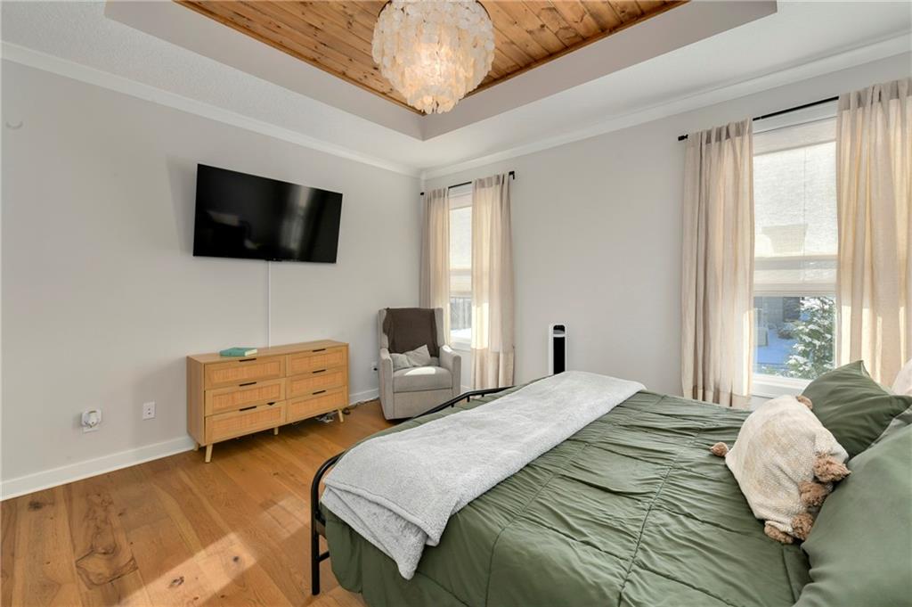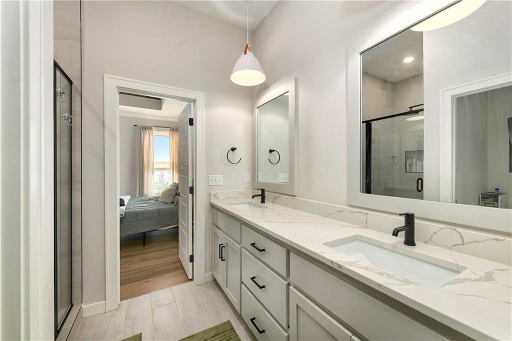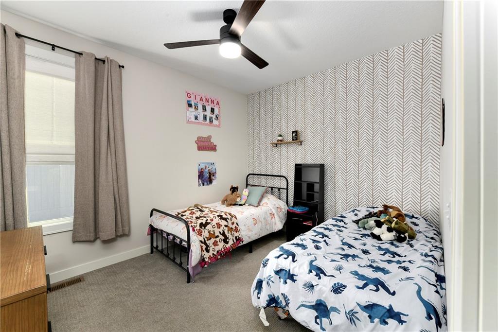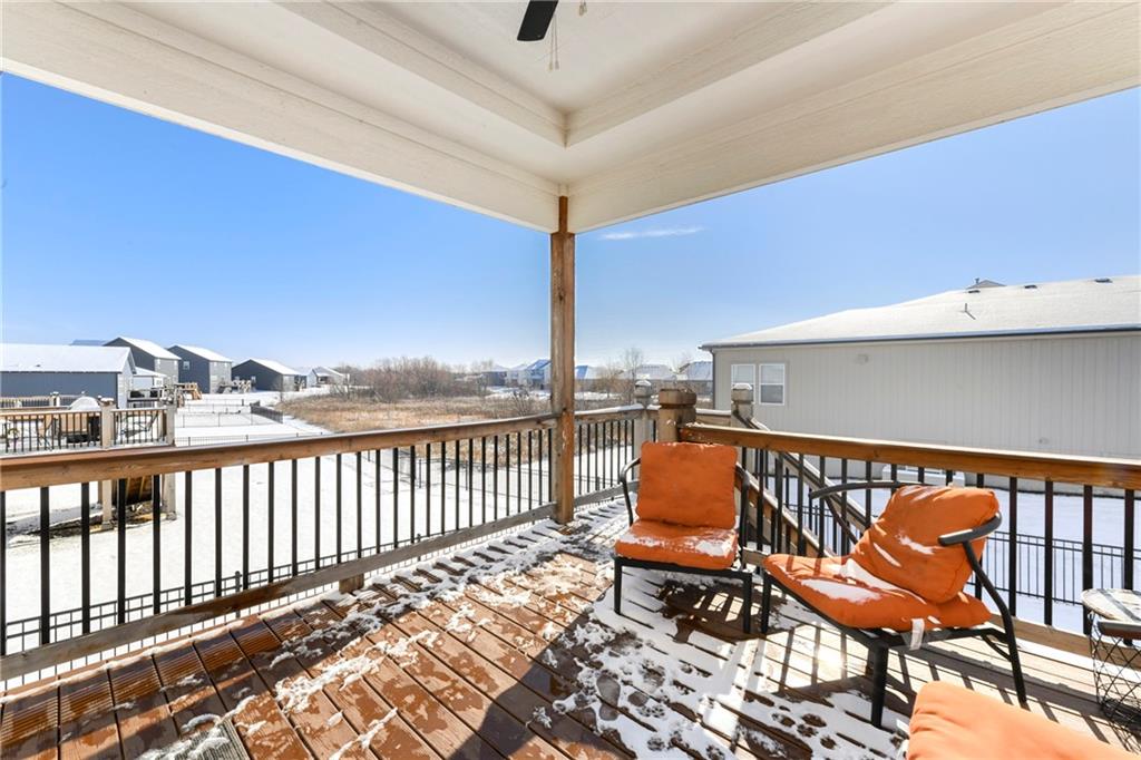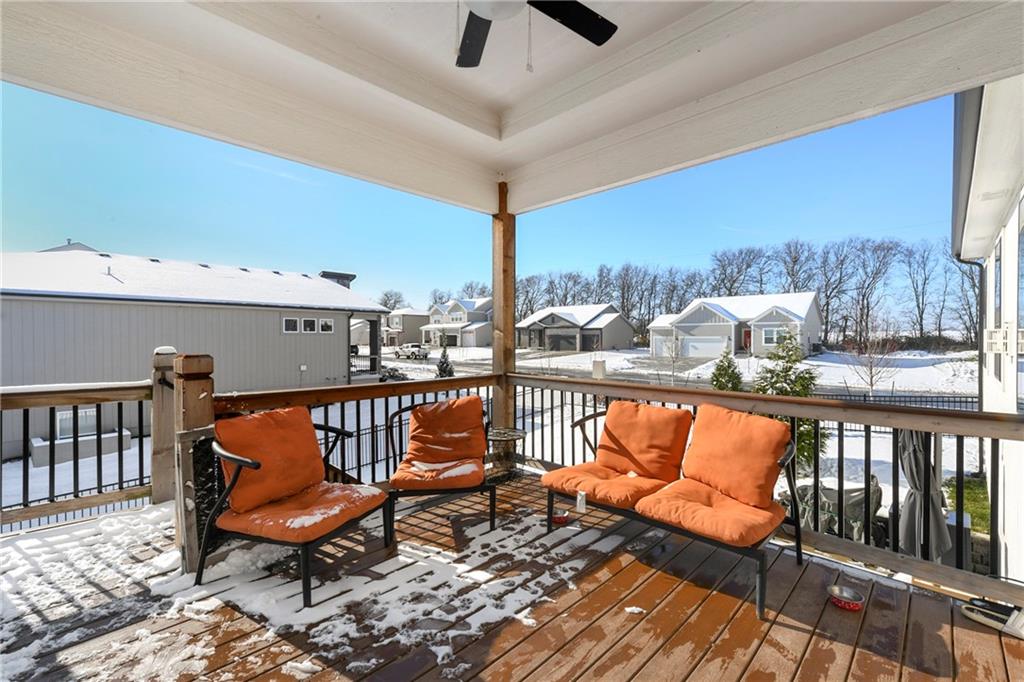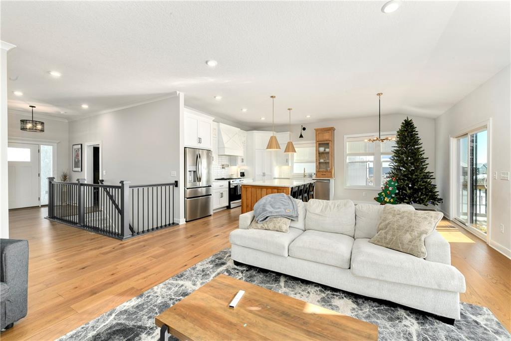 Immaculate 2-year-old Reverse Ranch on a premium corner lot featuring a modern open layout, upgraded finishes, and exceptional indoor/outdoor living spaces. This former model home showcases a spacious great room with floor-to-ceiling stone fireplace, large windows for abundant natural light, and engineered hardwood floors throughout the main living areas. The designer kitchen includes quartz countertops, large center island w/ seating, upgraded trim, Gas Range w/Convection, pot-filler, stainless appliances, farmhouse sink, brushed brass fixtures, glass-door display cabinetry, and subway tile backsplash. The dining area flows seamlessly to the covered deck overlooking the fenced backyard. The primary suite offers a tray ceiling with wood plank detail, large windows, and a spa-inspired bath with dual quartz vanities, upgraded lighting, a walk-in tile shower with bench, herringbone accent wall, and matte black fixtures. The oversized walk-in closet connects conveniently to the laundry and mudroom w/ built-in drop zone. Additional main-level bedrooms include upgraded lighting & modern wall accents along with attractive wood finishes in the vanity and matching mirror. A second full bath features contemporary vertical tile and updated finishes. The finished lower level provides a generous second living area with recessed lighting, plush carpet, & a wet bar with custom backsplash. Additional bedroom & full bath offer flexibility for guests or extended living arrangements. The unfinished portion is plentiful too, providing value add for future finished space or great storage as it sits. Outdoor features include a covered deck, fully fenced yard with wrought iron fencing, and ample space for recreation. The climate-controlled garage is ideal for storage, hobbies, or year-round comfort. Additional upgrades include premium lighting throughout, wainscoting and trim accents, energy-efficient windows, & a clean modern color palette. Move-in ready and well maintained.