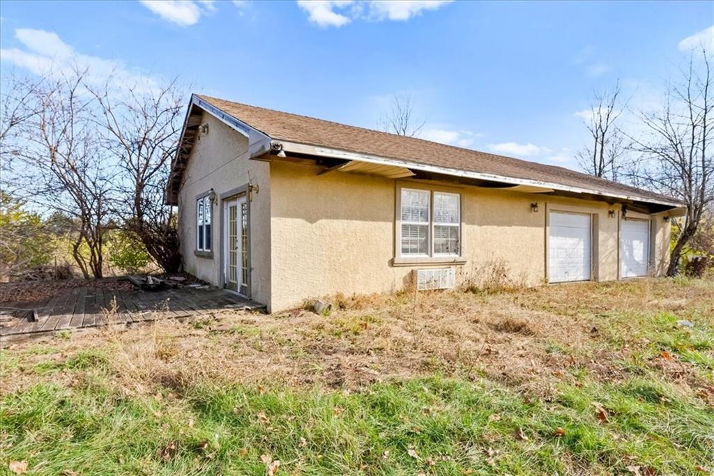 Escape to private, picturesque, and close-in country living with endless possibilities. Tucked away on a beautiful 24 acre setting on paved roads just outside the city limits of Lawrence, KS, this unique property offers a mix of mature woodlands, open pastures, a large pond and plentiful wildlife. At the center of this gorgeous land is a charming stucco, 2 bedroom, 2.5 bath, true ranch home offering 2146 sq. ft of main floor living area, an open floor plan with a large open great room with wood burning fireplace, an open kitchen with stained cabinets, an island with breakfast bar, a pantry, all appliances and a dining room with large radius picture window overlooking the gorgeous views of the pond. Rounding out the main level is a master suite with vaulted ceiling, large walk-in closet with built-ins, a master bath with stacked washer/dryer, jetted tub, walk-in shower, and water closet; an additional guest bedroom, a full bath with tiled shower/tub, and a half bath off the kitchen. The full walk-out basement was originally finished with an additional 1100 sq. ft. of living area including a recreation room, family room, 3rd bedroom, full bath and ample storage areas, but due to a water leak with subsequent mold, the basement has been remediated with floor and wall coverings removed down to the studs, which now await your personal decorative touches. Don't forget the matching stucco outbuilding/workshop/garage which offers a kitchenette, an office, a full bathroom, a mini-split HVAC and 4 overhead garage doors for all your cars, equipment and workshop needs. Whether you’re envisioning a hobby farm, renovating the existing home, building your dream home, a quiet weekend retreat or a place to enjoy hunting, fishing, ATV’s, riding horses and exploring nature, this property awaits your decorative vision to create a lifestyle worth dreaming about. Don't miss this opportunity to Bid Your Price. Bidding Ends: December 30 at 1:00 pm.